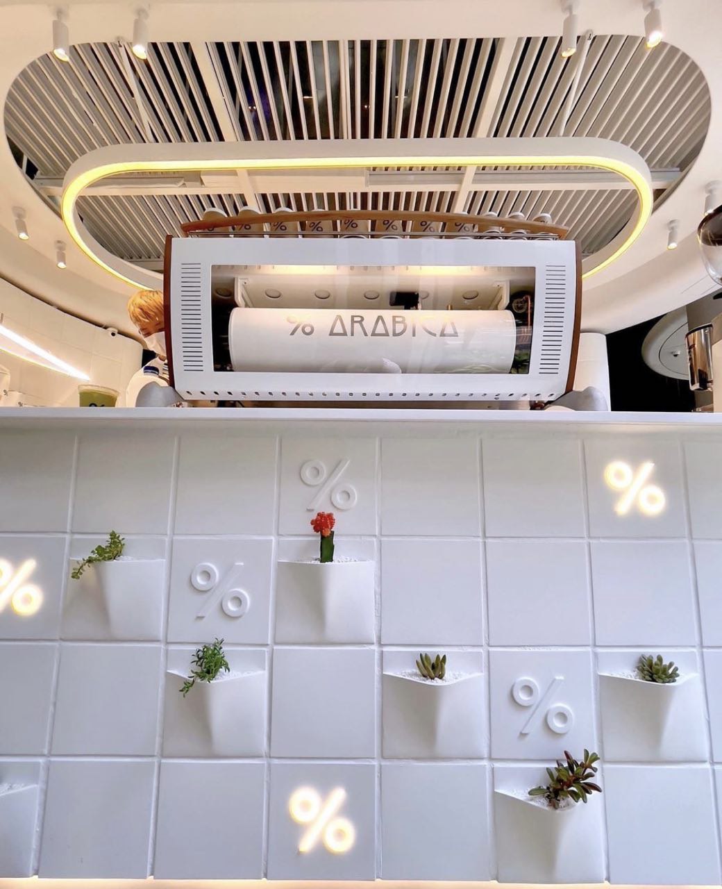 Coffee has never looked so good—the new %Arabica outlet is decked in the chain’s classic all-white minimalist aesthetic, with original % logo tiles and planter tiles displaying adorable little plants, succulents and cacti surrounding the facade.