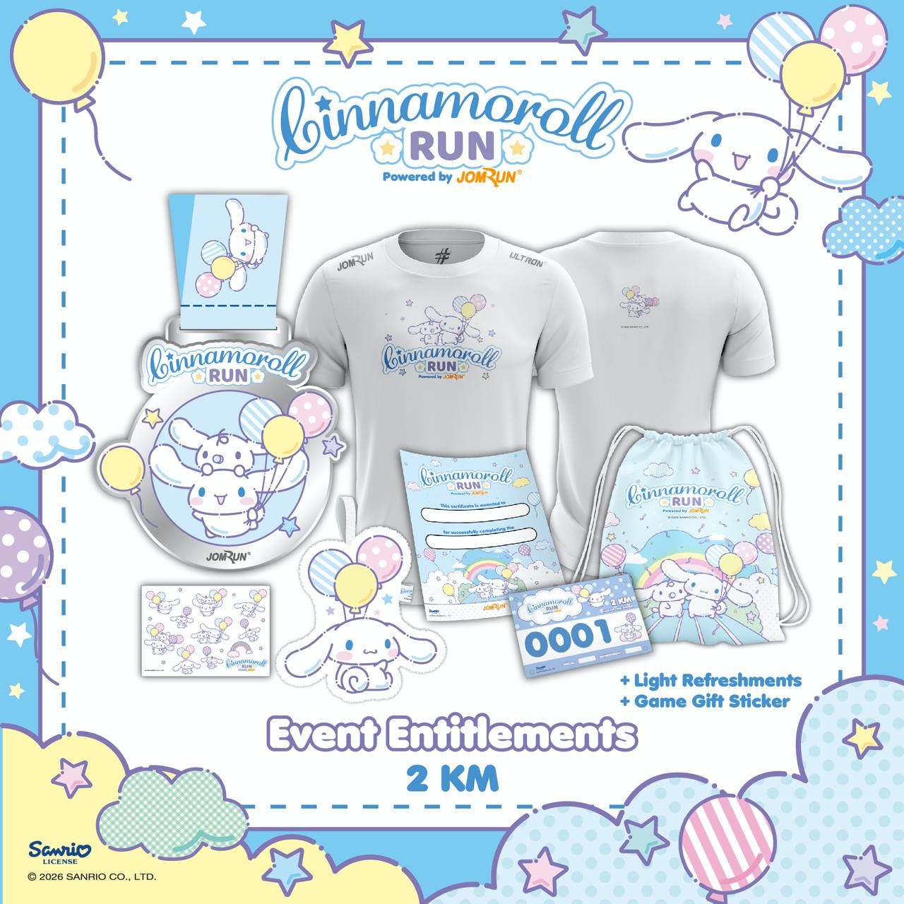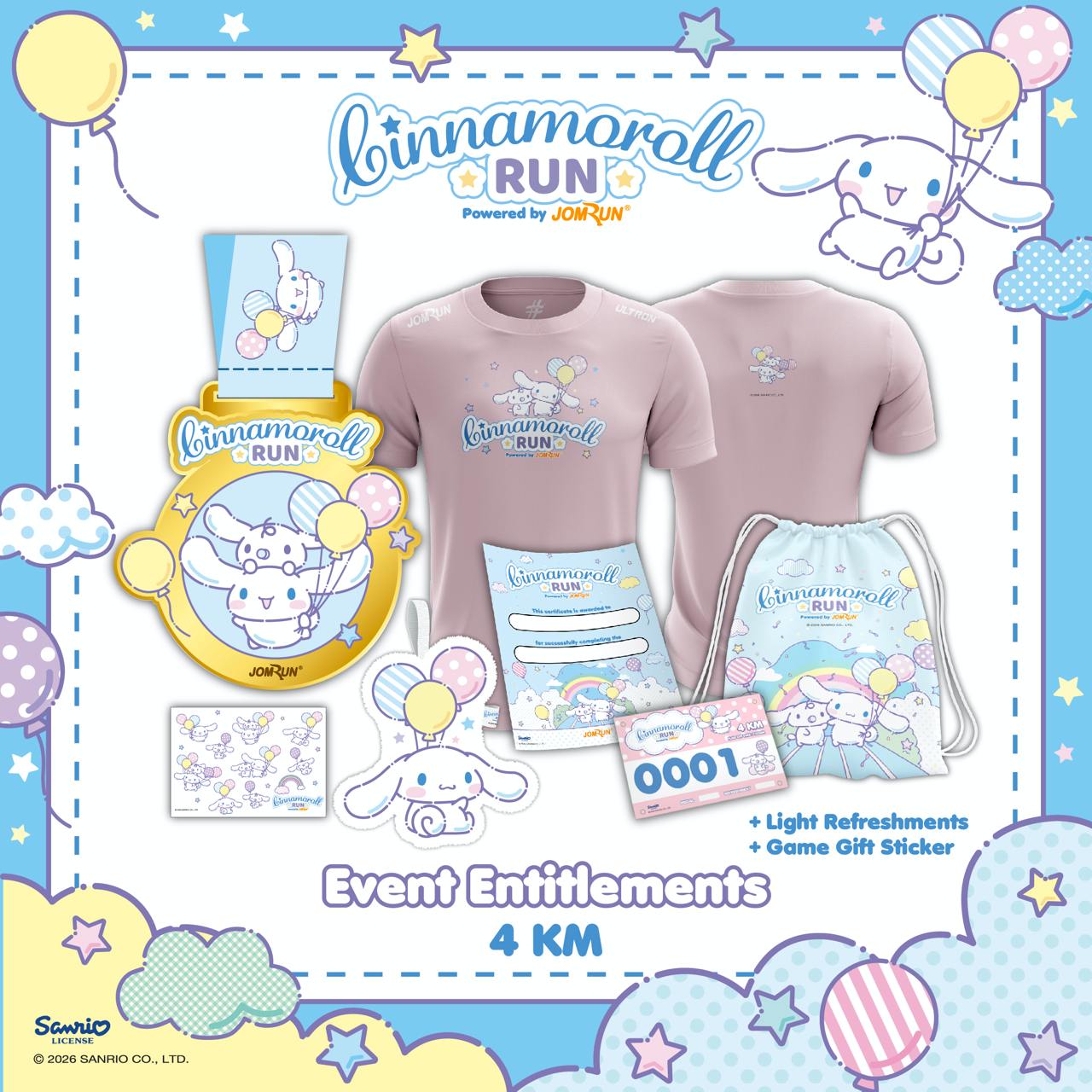 This upcoming Cinnamoroll Run 2026 is hosted by JomRun Singapore, and features a 2km or 4km run. Participants of the run will get an exclusive Cinnamoroll-themed running pack, which includes merchandise and apparel like a jersey shirt, race bib, hand towel and tattoo sticker pack. Runners are also entitled to light refreshments, and finishers will even get a special finisher medal.