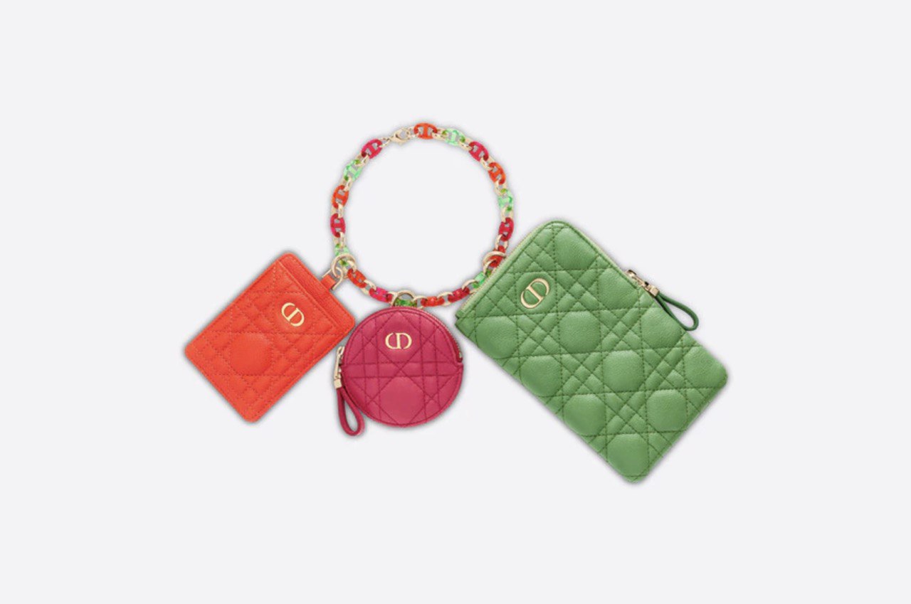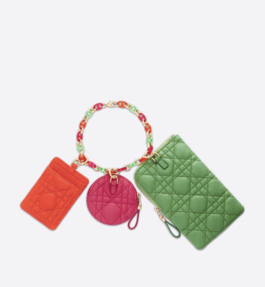 The new Spring/Summer 2022 Dior Caro collection features brand new vibrant colourways, different from Dior’s usual neutral colour palette. The Dior Caro Tri-Pouch ($2550) features 3 whimsical and playful colours, perfect for the spring and summer: vibrant orange, pink and green. This bright and trendy Tri-Pouch can be worn multiple ways, and each component is removable. Wear the Tri-Pouch altogether like a wristlet, with its resin and metal “CD” linked wrist chain, or individually as a card holder, coin compartment and phone holder.