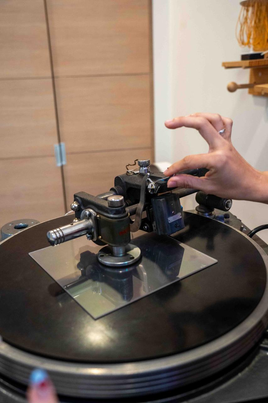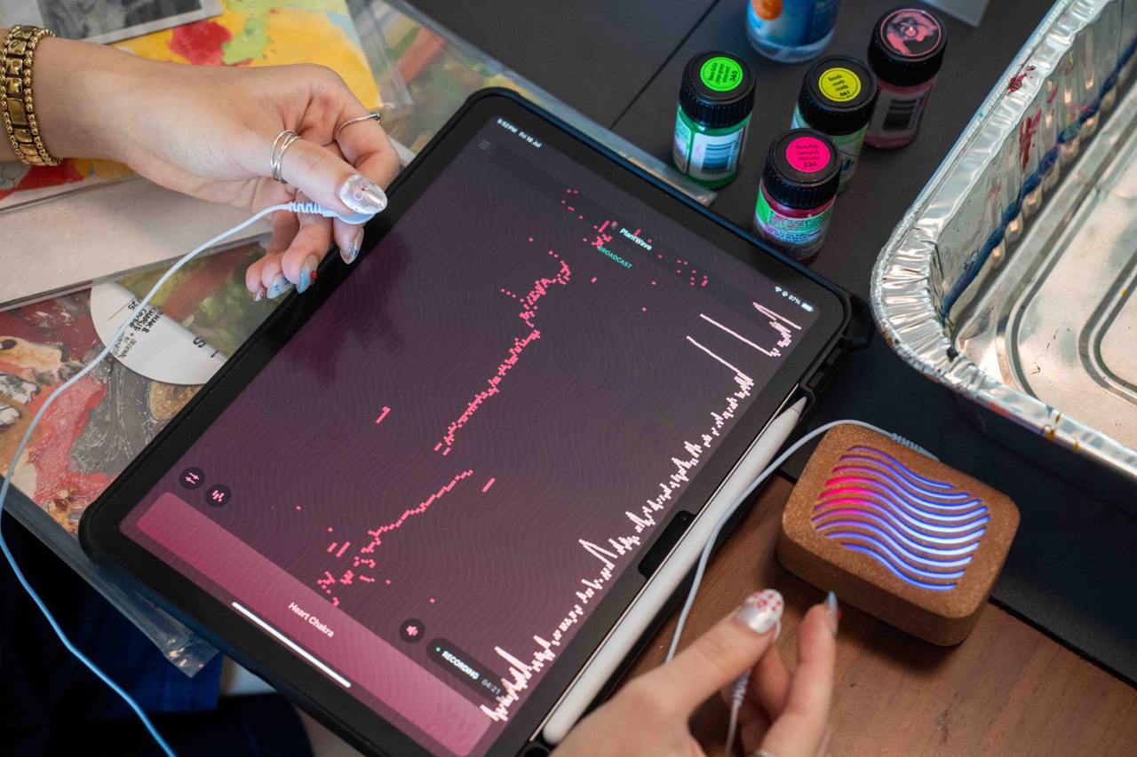 Before your workshop session, you can send over your own audio recording (up to 7 minutes) to be mastered into a track. For this part, do note that copyrighted commercial or Spotify music by other artists will not be accepted to be used for your custom vinyl record. All audio clips used for the workshop must be royalty-free, to protect the work of all artists involved. Some examples of audio clips that you can use include personal voice recordings, ultrasounds, your own singing or playing of instruments, recordings of ambient sounds and more. If you don’t have any audio clips on hand, not to worry: ART/ST also offers a special Bio-rhythm Recording technique that you can do on the spot. How it works is that you’ll and your partner will be linked up via sensors that will record your body’s internal bio-rhythm and turn that into a distinct, listenable sound.