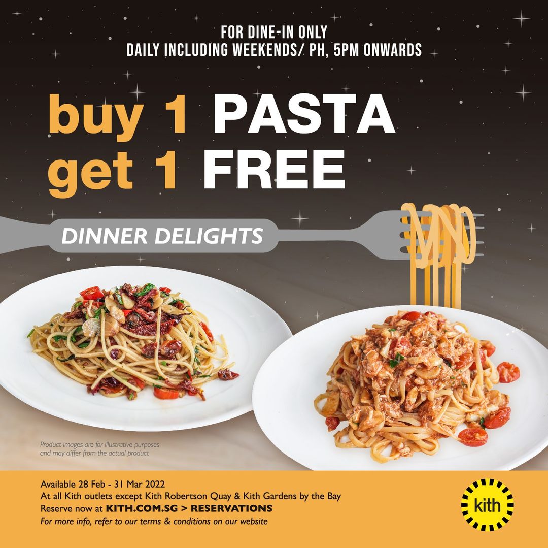 Kith Café is having a special 1-for-1 promotion on all pastas for the entire month of March!As part of their Dinner Delights promotion, you get to enjoy 2 pastas for the price of one! Choose from pastas like Carbonara ($17.95), Pollo ($18.95), Ravioli ($18.95), Gamberetti ($21.95) and more.