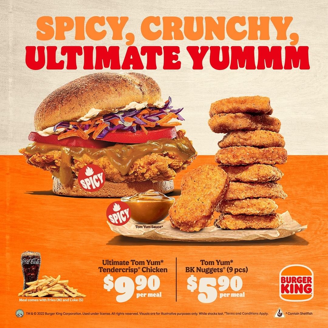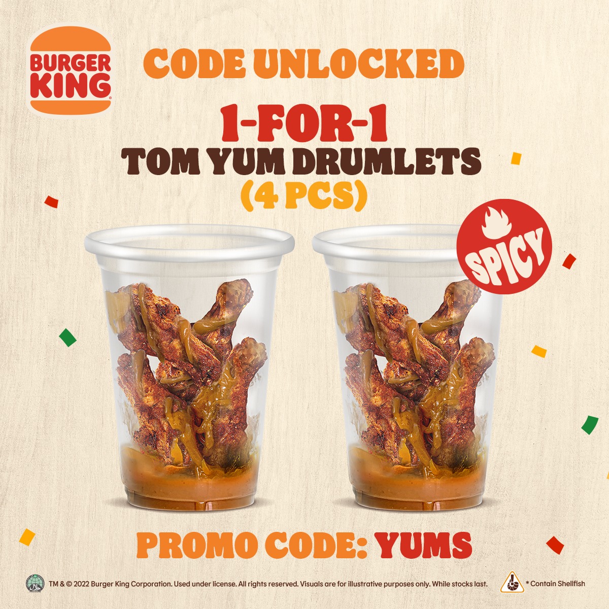 Burger King has recently launched their new Tom Yum series, with Tom Yum Tendercrisp Chicken burgers, Tom Yum BK Nuggets and more; and as a special treat for all Burger King fans, they will be offering 1-for-1 on their 4-pc Tom Yum Drumlets ($4.90), so you’ll be getting a total of 8 pcs of spicy Tom Yum Drumlets!