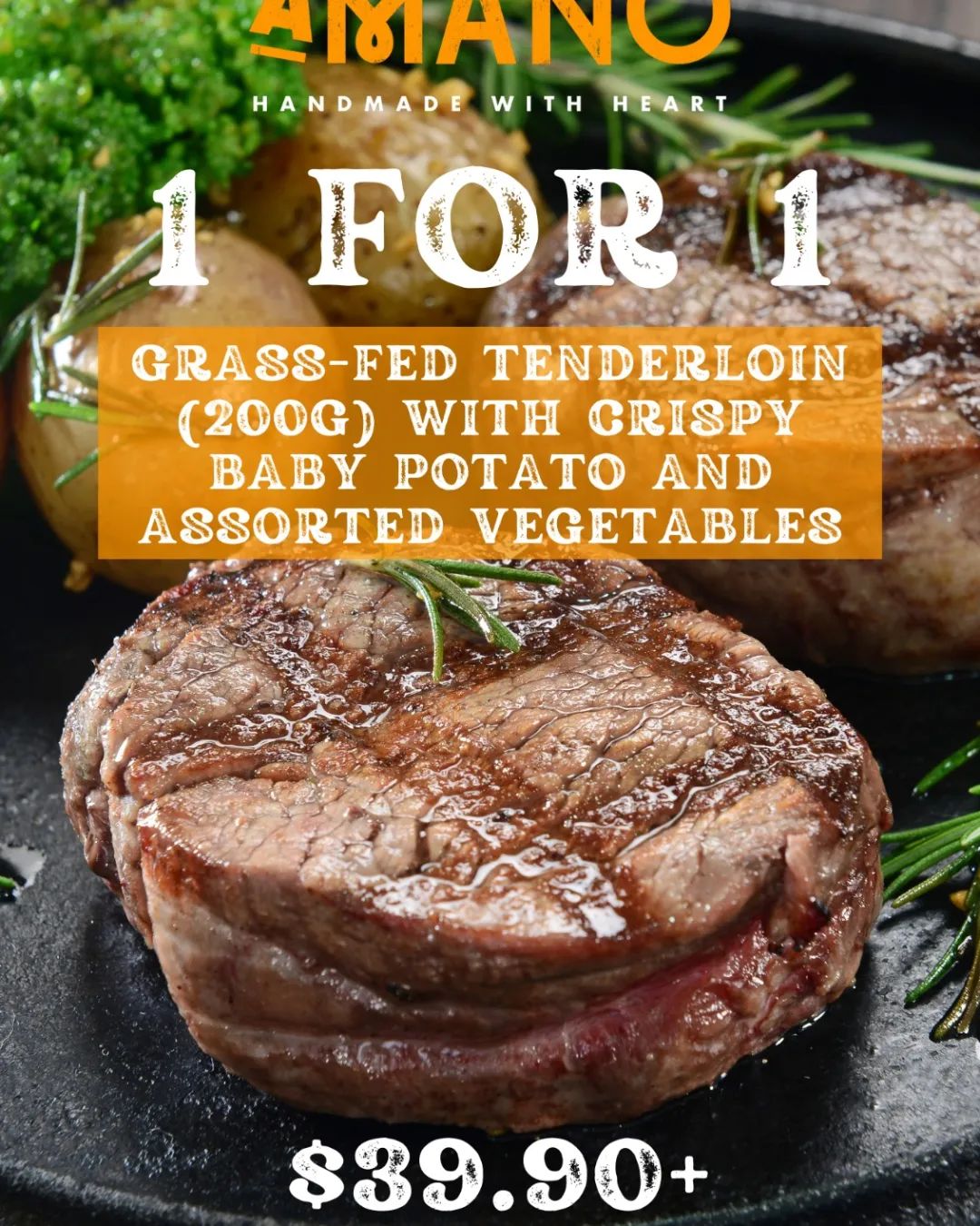 Here’s one for all the meat lovers out there: Italian restaurant Amano is offering 1-for-1 200g Grass-fed Tenderloin Steaks ($39.90) daily! This means that for just $39.90, you get a total of 400g of tender, perfectly grilled meat!