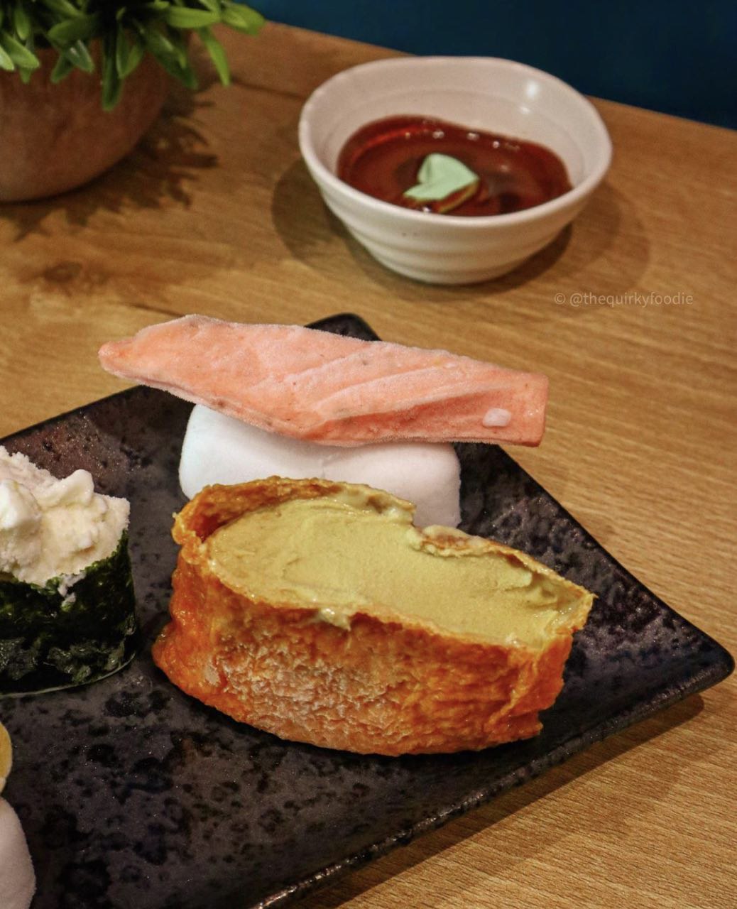 All 4 pseudo sushi are made entirely from gelato, and even the “soy sauce” and “wasabi” are made from chocolate sauce and whipped cream.
