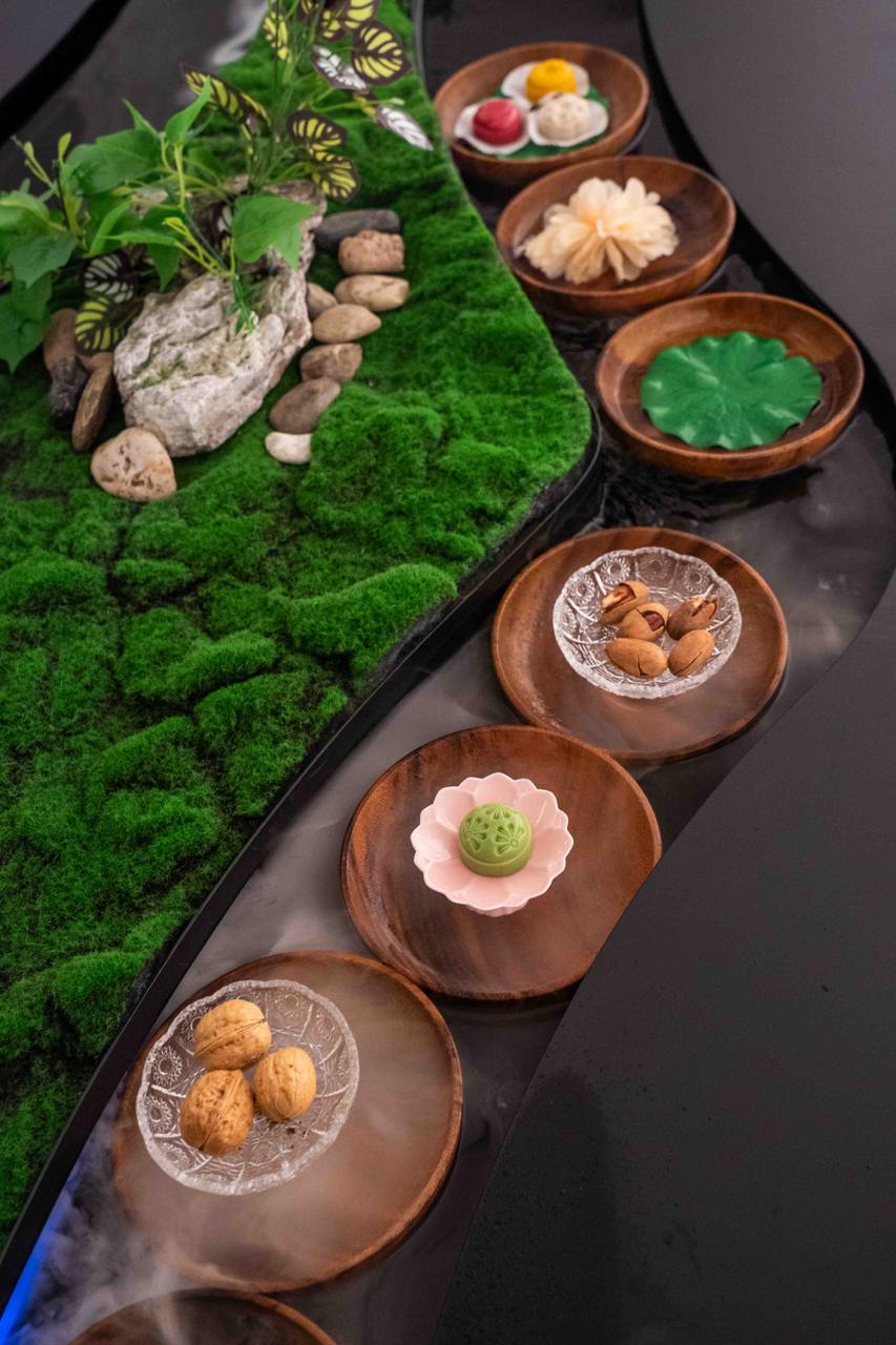 Aside from faux flowers floating in the water, there’s also wooden plates where you can place your tea cups, pastries and snacks, and float them across the stream—perfect for if you want to share your treats with someone else on the table, maybe? Just be careful to place the items right in the middle of the plate, and make sure it’s not too heavy, or else it’ll sink down into the water.
