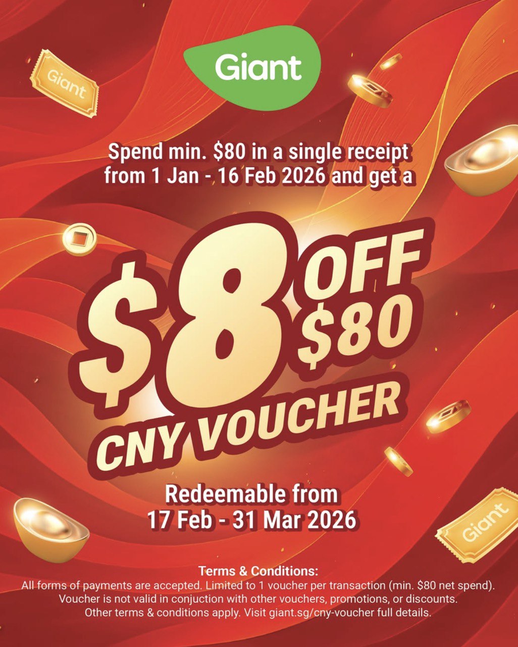 From now till 16th February 2026, spend a minimum of $80 nett in a single receipt at any Giant store, and you’ll receive a free $8 return voucher for your next shopping trip. The $8 return voucher can be used at any outlet from 17th February to 31st March 2026.