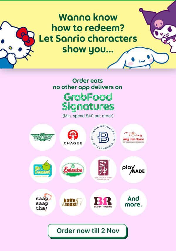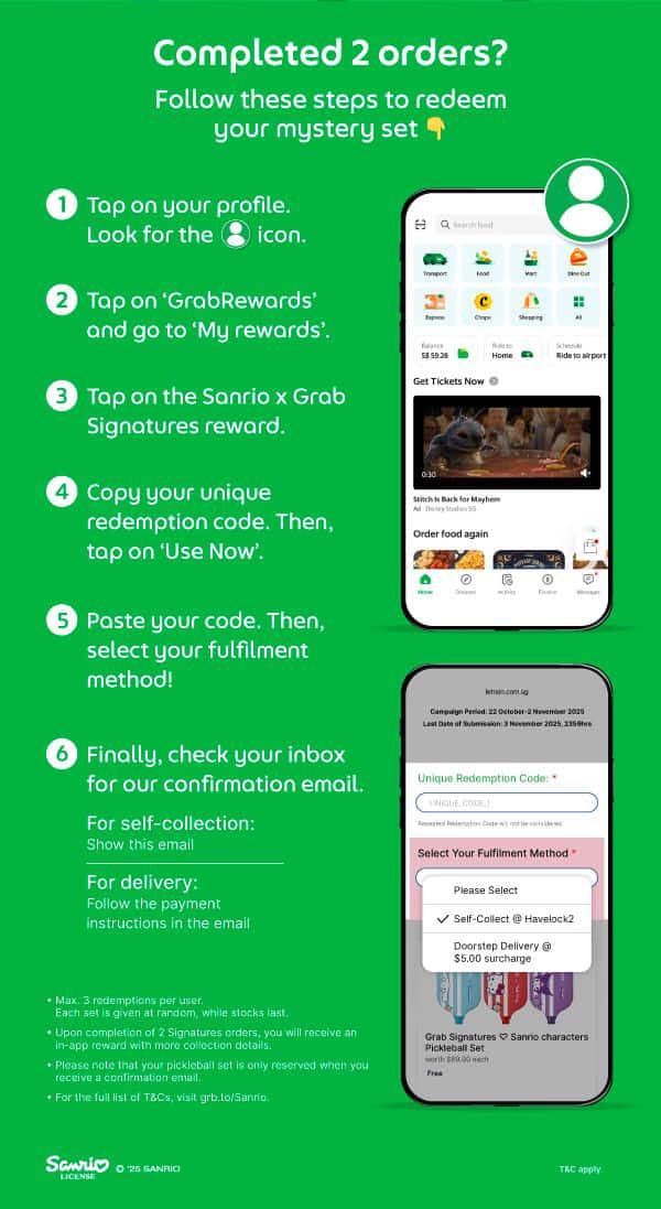 All you have to do to redeem the Sanrio Pickleball set is make any 2 valid Grab Signatures food orders online via the app. You can pick from over 100 eats or retail brands on the app, either from GrabFood (minimum $40 spend) or GrabMart (minimum $65 spend). Once you’ve completed 2 valid orders, follow the instructions below to claim your free Sanrio Pickleball set, while stocks last:
