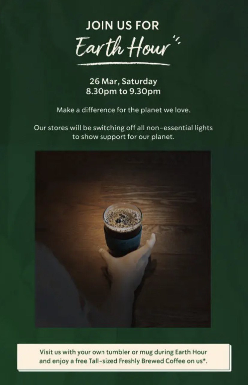 We love our earth, and so does Starbucks! On 26th March 2022, from 8.30pm-9.30pm, Starbucks will be taking part in the Earth Hour event by switching off all of its non-essential lights across all outlets in Singapore.