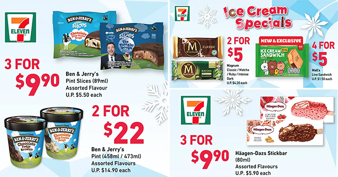 Get an entire range of ice cream deals from now till 8th June, when you shop exclusively at 7-Eleven! Running for a limited time only, while stocks last, these promotions invite guests to purchase two Magnum stickbars for a mere $5 (U.P. $4.20 each), four Wall’s LINE Ice Cream Sandwiches for $5 (U.P. $1.50 each), three 89ml Ben & Jerry’s Pint Slices Assorted Flavours for $9.90 (U.P. $5.50 each), two 473ml Ben & Jerry’s Pint Assorted Flavours for $22 (U.P. $14.90 each), three 80ml Häagen-Dazs Stickbar Assorted Flavours for $9.90 (U.P. $5.90 each), and six 75ml Häagen-Dazs Mini Cups Assorted Flavours for $10.90 (U.P. $21.60).