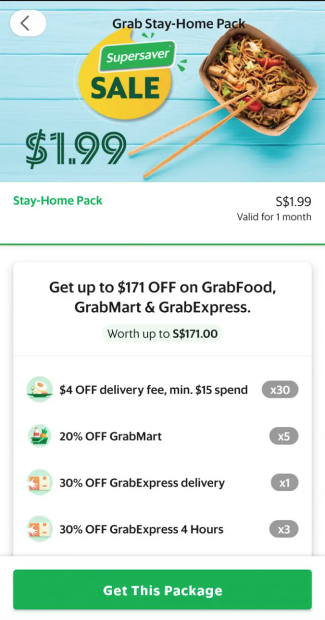 Renewed on a monthly-basis, this package deal will encompass the following promotions – 30 x $4 OFF delivery fee (min. $15 spend), 5 x 20% OFF GrabMart, 1 x 30% OFF GrabExpress delivery, and 3 x 30% OFF GrabExpress 4 Hour delivery.