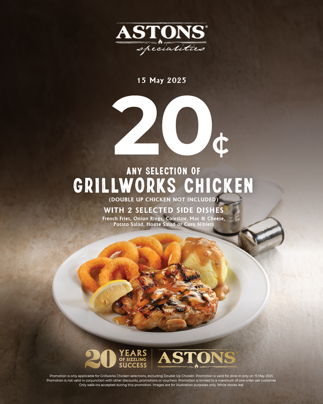 This 20 cent offer is only valid for walk-ins; and for one day only, on 15th May 2025. Redemption for the 20 cent Grillworks Chicken is limited to one order per person, while stocks last; and excludes Double Up Chicken. The 20 cent Grillworks Chicken promotion will also be offered at all ANDES by ASTONS outlets on 19th May 2025.