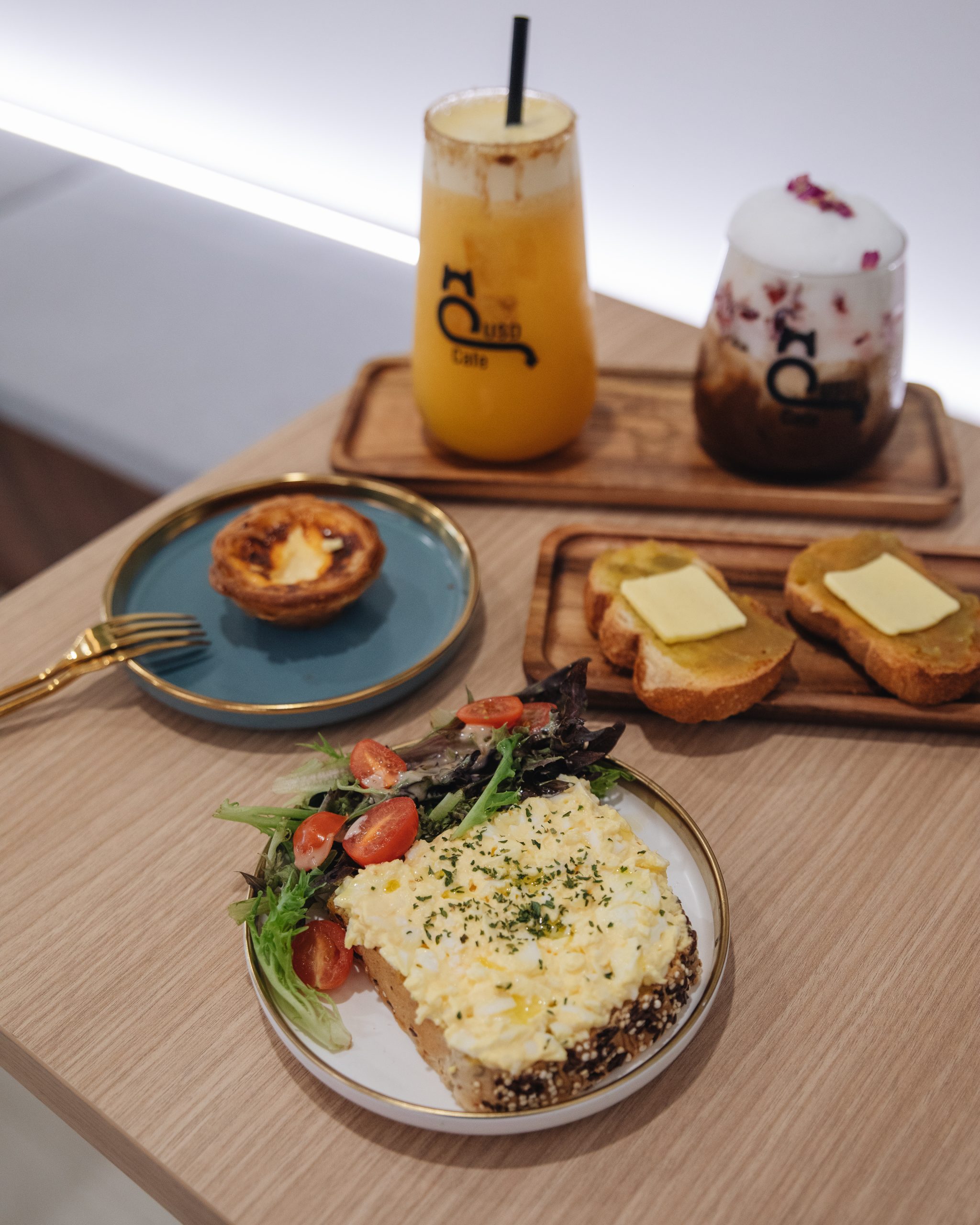 For bites, USD Café has a couple of local-inspired snacks like Kaya Butter Toast ($4), Flossy Muffin ($5), Pandan Cheese Cake ($9); as well as light brunch items like Egg Mayo Toast ($12), Avocado Sour Cream Toast ($12) and more!