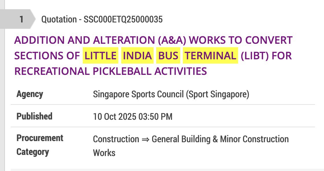 On 10th October 2025, a Request for Quotation (RfQ) was published on GeBIZ titled “Addition and Alteration (A&A) Works to Convert Sections of Little India Bus Terminal (LIBT) for Recreational Pickleball Activities” (reference no. SSC000ETQ25000035). The move comes in accordance with Sport Singapore’s (SportSG) plans to open more accessible pickleball facilities across the island. Currently, Little India Bus Terminal only operates as a private pick-up point on Sundays, and with this new retrofitting plan in place, part of the terminal will be allocated for recreational pickleball use as well.
