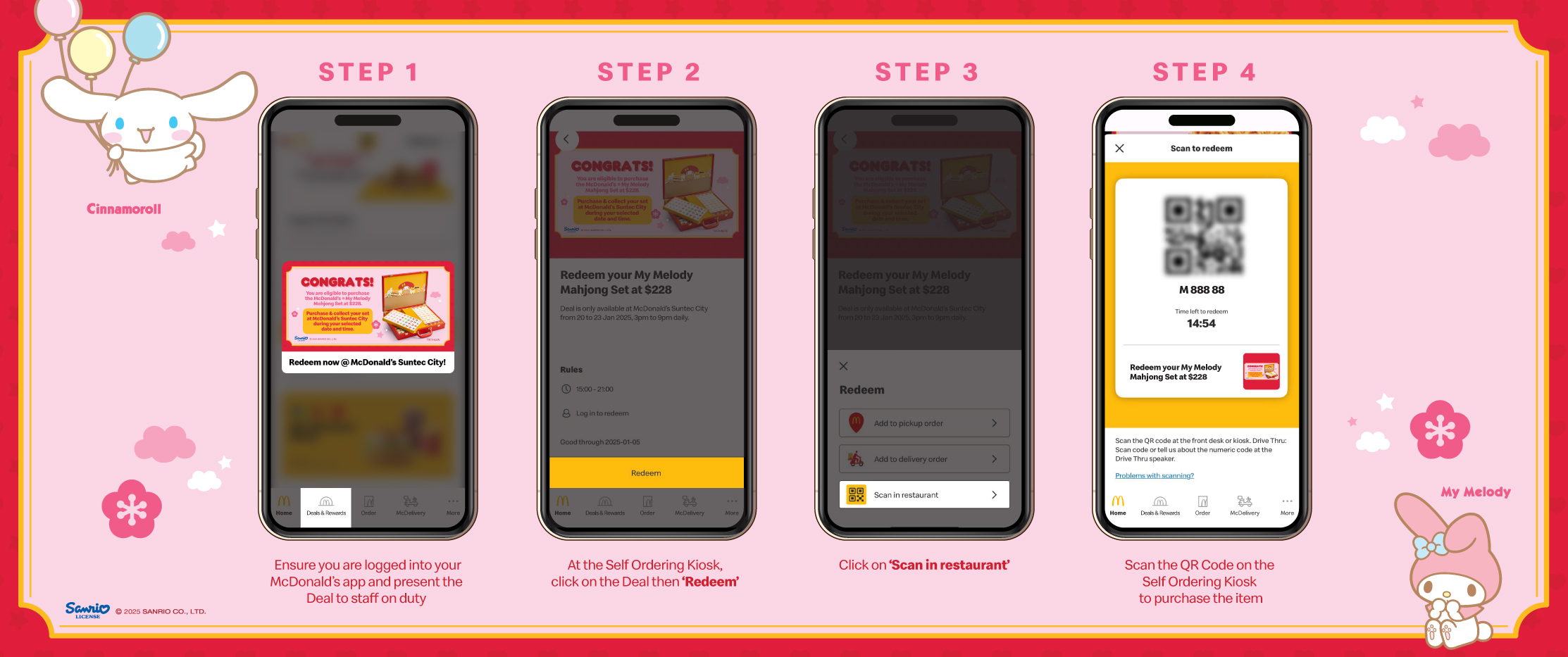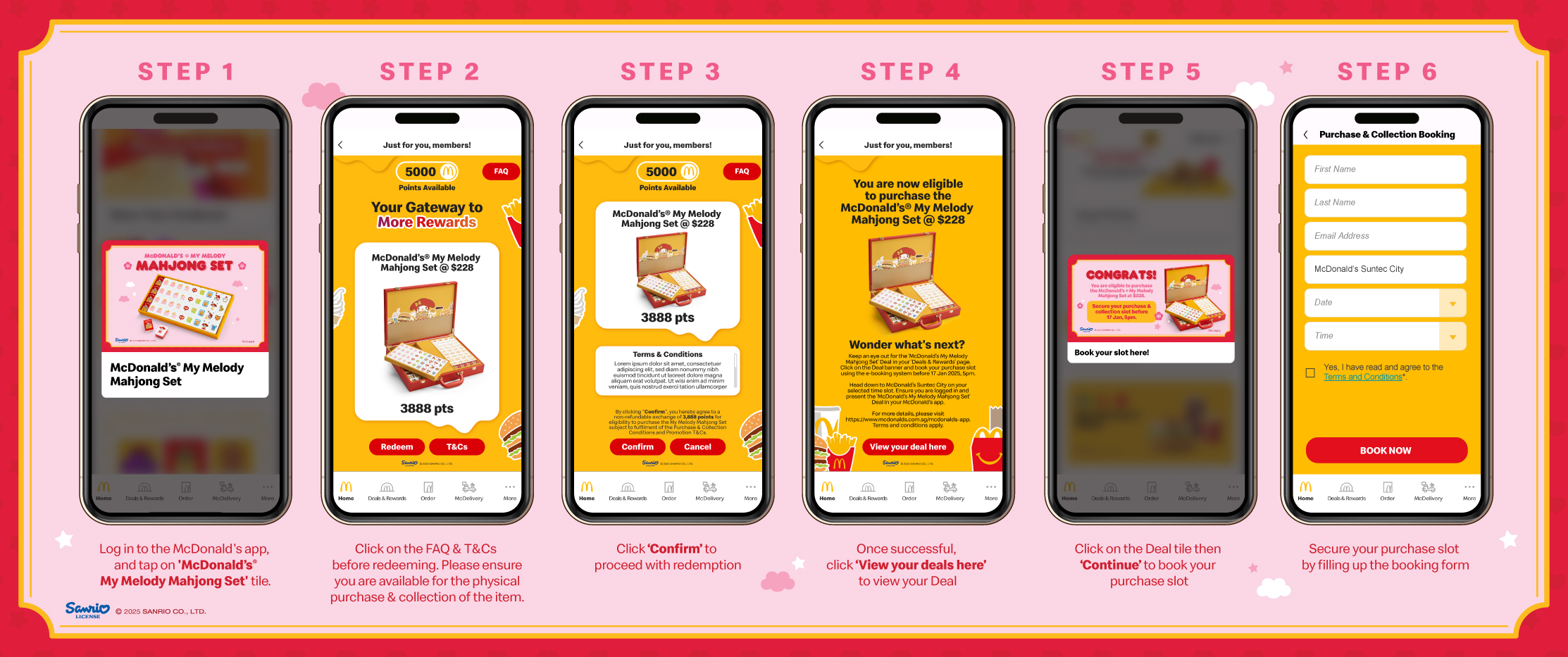 The coveted My Melody Mahjong Set is exclusively available for MyM Rewards members to redeem and purchase, and there are 2 steps to do so via the McDonald’s app: first, exchange 3,888 points to be eligible for a purchase slot, then proceed to book an appointment to purchase the set in-store for $228. Follow these instructions for how to redeem/purchase the mahjong set: