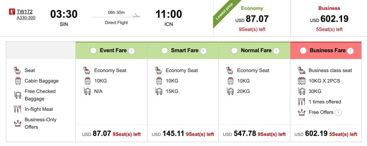Cheapest flights for the flat-bed Business Class for a Singapore-Seoul round trip is $602.19 USD (~$827.54) inclusive of taxes and fuel surcharge (while stocks last). Prices are subject to change according to the exchange rate and time of purchase. Book your T’way flight here