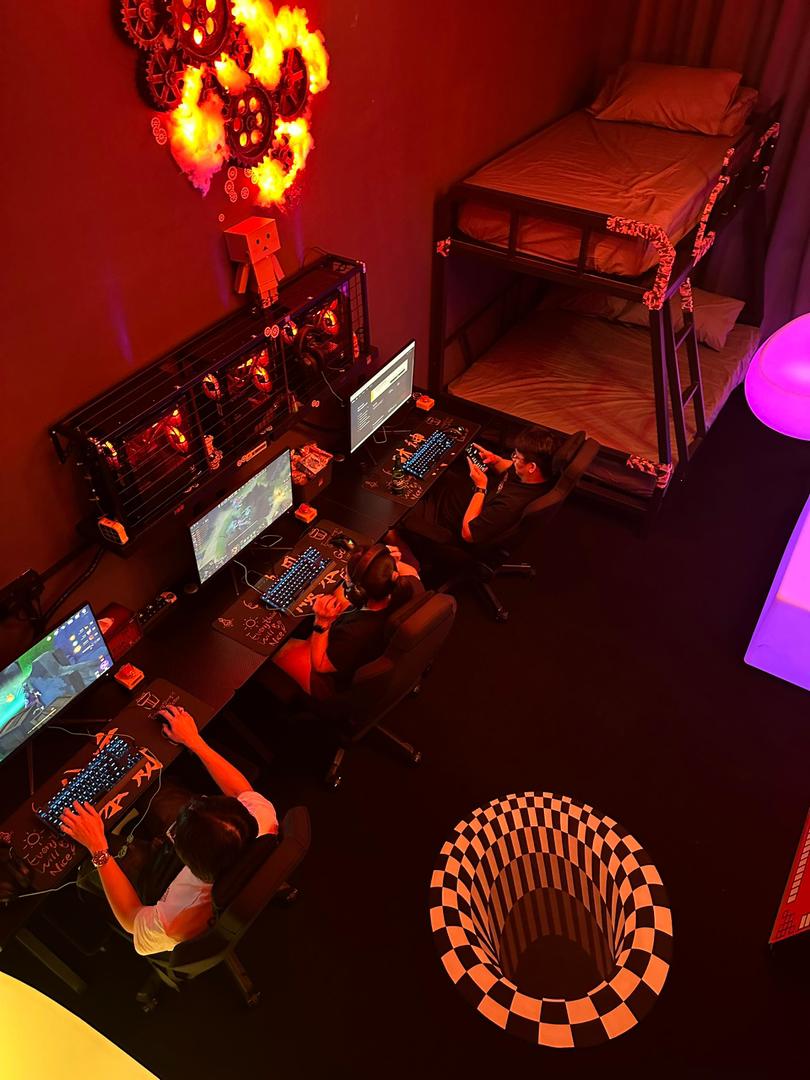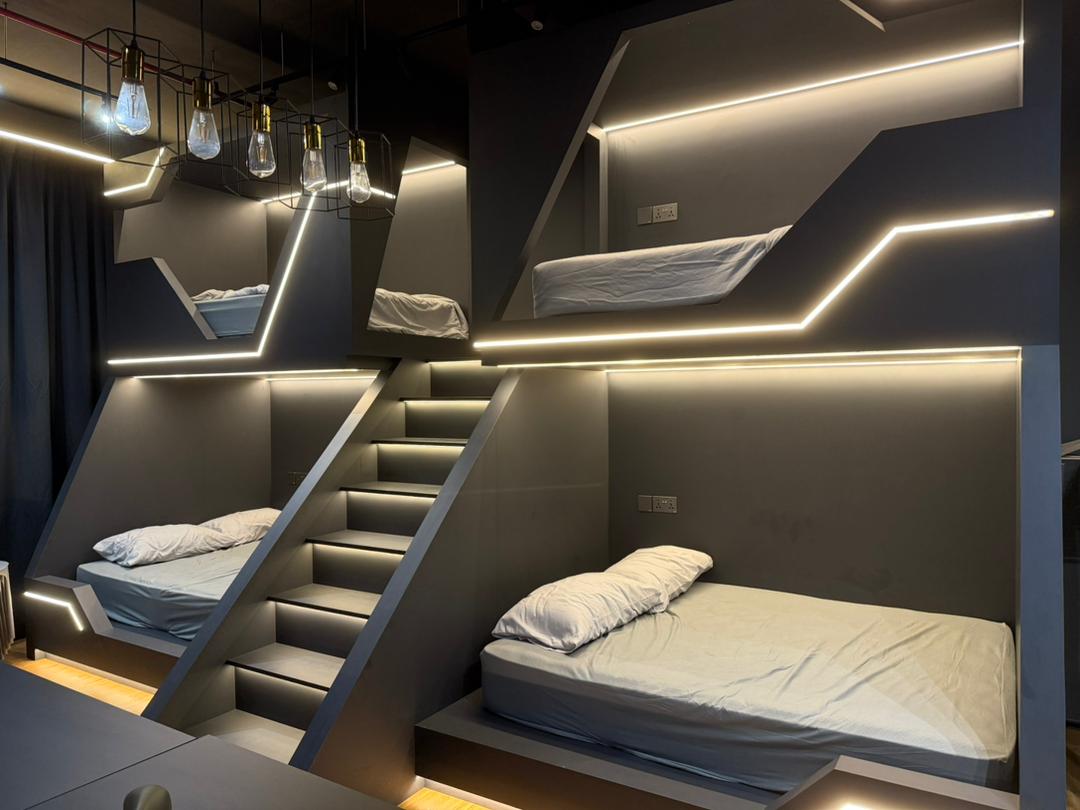As for sleeping arrangements, the rooms are fitted with cool sloping bunk beds and stairs instead of the usual ladders. There are also themed bedrooms with even more vibey coloured neon lights, and gaming-inspired decor walls. Within the building itself, there’s also an outdoor rooftop pool, sauna room, gym and other facilities.