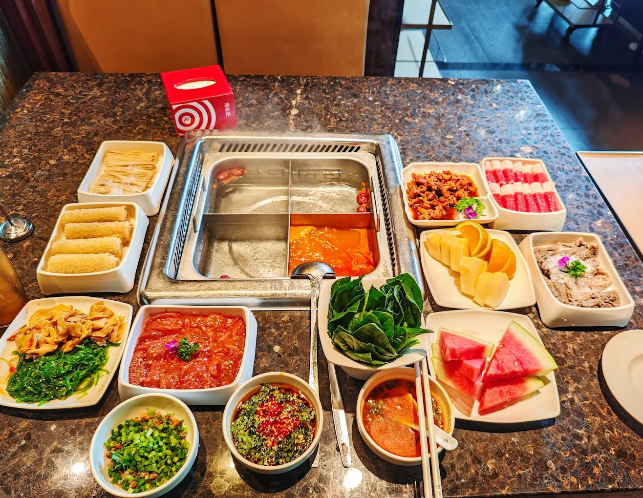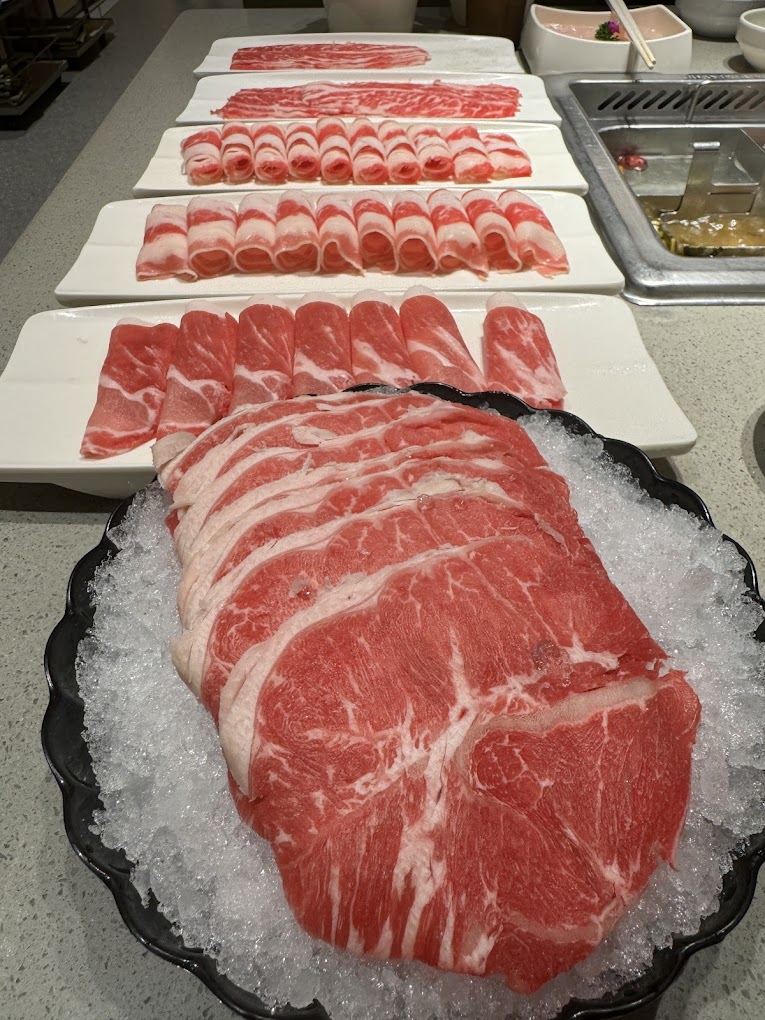 Some dishes you can order as part of the buffet include Beef Short Plate, Black Pork, Sliced Fish, Aussie Sliced Lamb Shoulder, Fish Ball with Roe, Fried Crispy Fish Skin, Cheese Tofu, Luncheon Meat, Seafood Mushrooms, Chinese Yam, Meat & Chives Dumplings, Sweet Potato Balls, Brown Sugar Lava Rice Cake and much more.