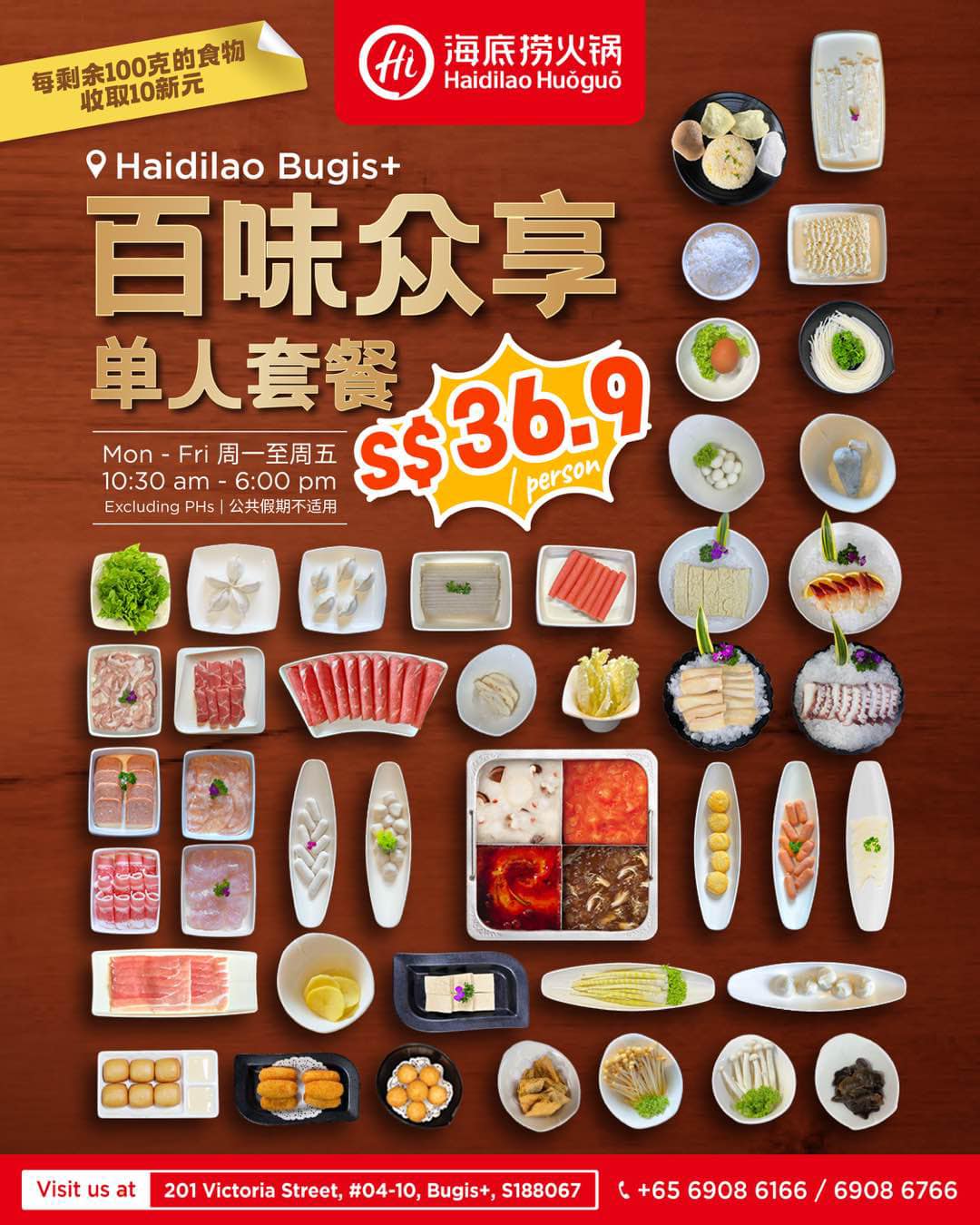 The Feast for One buffet is available exclusively at HDL’s Bugis+ outlet on weekdays (Monday to Friday) from 10.30am to 6pm; and is limited to a dining time of 2 hours. Note that you can only select one 1/4 pot of soup; and the buffet price does not include condiment bar or beverage charges.