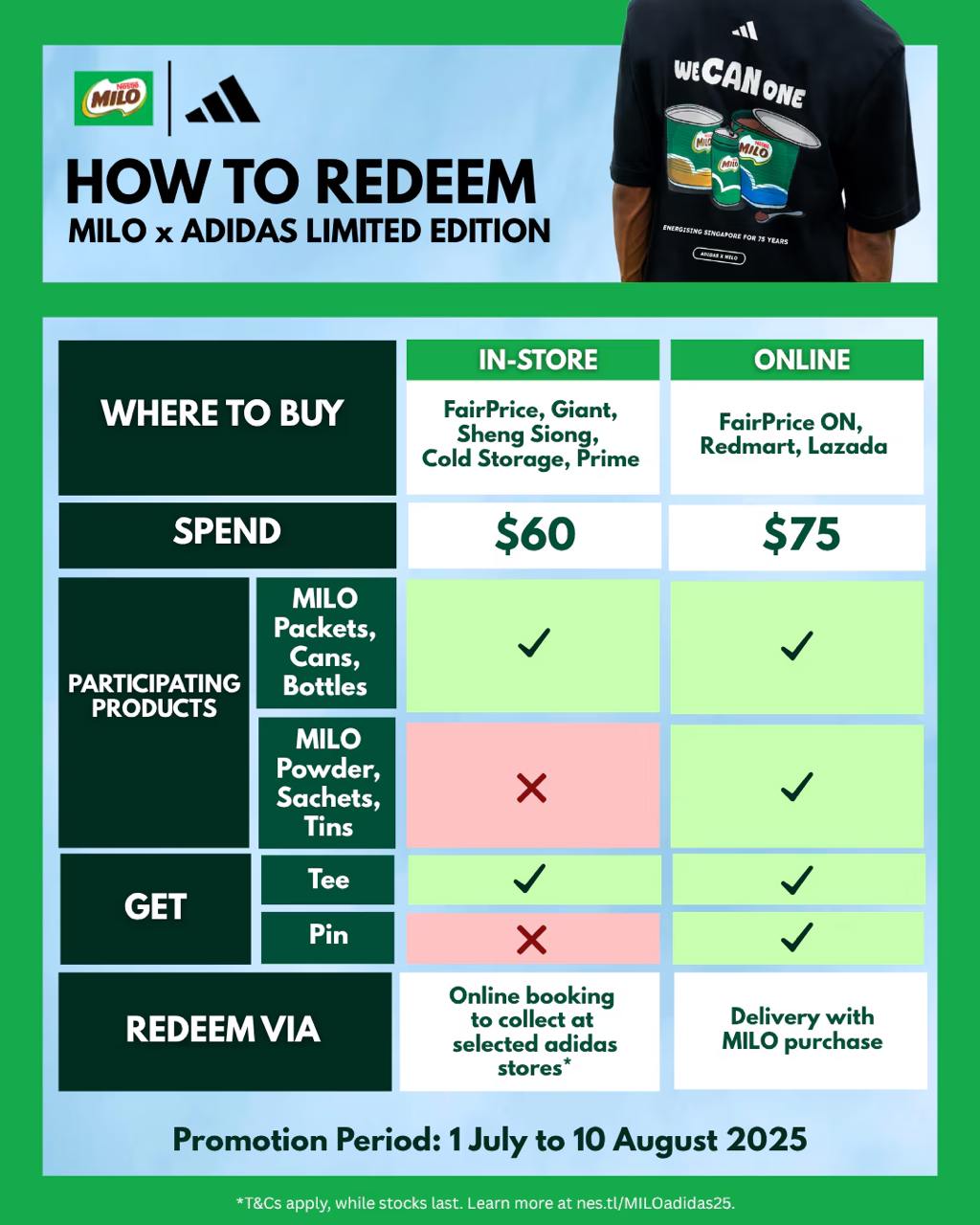 There are 2 different ways you can redeem the MILO x adidas collectible merchandise: either in-store or online. For in-store redemptions at FairPrice, Sheng Siong, Giant, Cold Storage and Prime outlets, only the t-shirts are available, with a minimum spend of $60 on MILO Ready-To-Drink items; after which you’ll be able to book a slot to collect your t-shirt at selected adidas stores. For online redemptions, you can redeem both a pin and t-shirt bundle, with minimum spend of $75 of both MILO powder and Ready-To-Drink items; the items will then be delivered straight to your home.