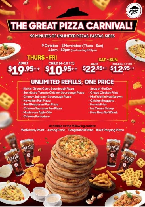 The Pizza Hut Dine-In Buffet is available on selected days of the week, from 11am to 10pm at $19.95++ per person on weekdays (Thursday to Friday) and $22.95++ per person on weekends (Saturday to Sunday). The unlimited buffet is also available at 4 selected Pizza Hut outlets in Singapore: Bukit Panjang Plaza, Jurong Point, Tiong Bahru Plaza and Waterway Point, from 9th October 2025 till 2nd November 2025.