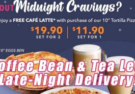 Available daily from 12am to 6am via GrabFood, FoodPanda, and Deliveroo, Coffee Bean & Tea Leaf is now serving 10” pizzas alongside complementary café lattes in sets of 1 for $11.90, and sets of 2 for $19.90! More