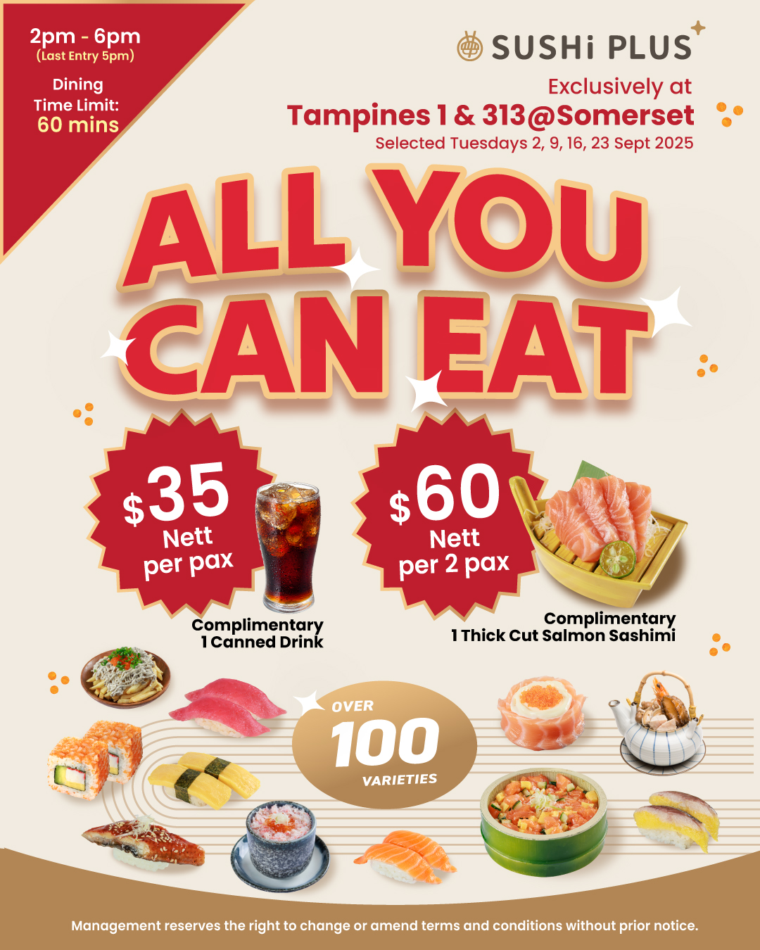 The sushi buffet is priced at $35 nett per person or $60 nett for 2 persons; which works out to just $30 nett per person. The All-You-Can-Eat Sushi Buffet is available exclusively at Sushi Plus’ Tampines 1 and 313@Somerset outlets on the following Tuesdays: 2nd, 9th, 16th and 23rd September 2025. Each buffet session is limited to a dine-in time of 60 minutes, with sessions from 2pm to 6pm.