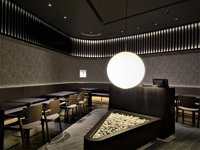 Greeting guests with an impressive liquor bar, decked in a myriad of exquisite sake and shochu from Japan, Sen-Ryo features strips of warm lighting, and thin columns of wood which serve as a divider between the bar and sushi counter.