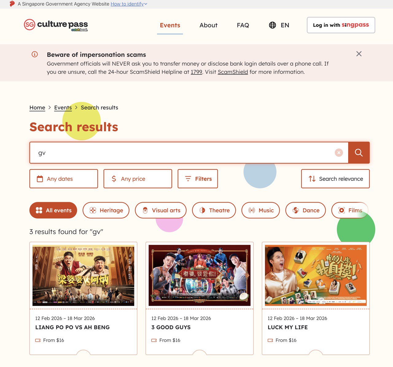The Culture Pass credits can be utilised on 3 selected local movies at Golden Village: 3 Good Guys《老婆,我爱你, Luck My Life《我的人生我自摸 》and Liang Po Po Vs Ah Beng 《梁婆婆VS阿炳》. You can redeem tickets to watch these movies for $16 using your credits, so your movie is essentially free. Follow these steps to redeem your movie tickets with your SG Culture Pass: