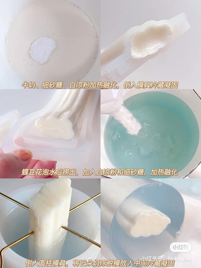 Begin your preparation process by pouring the milk, caster sugar, and white bean jelly powder into a singular bowl and stirring evenly. Once done, melt all ingredients in the bowl using heat and pour the mixture into cloud molds before freezing.