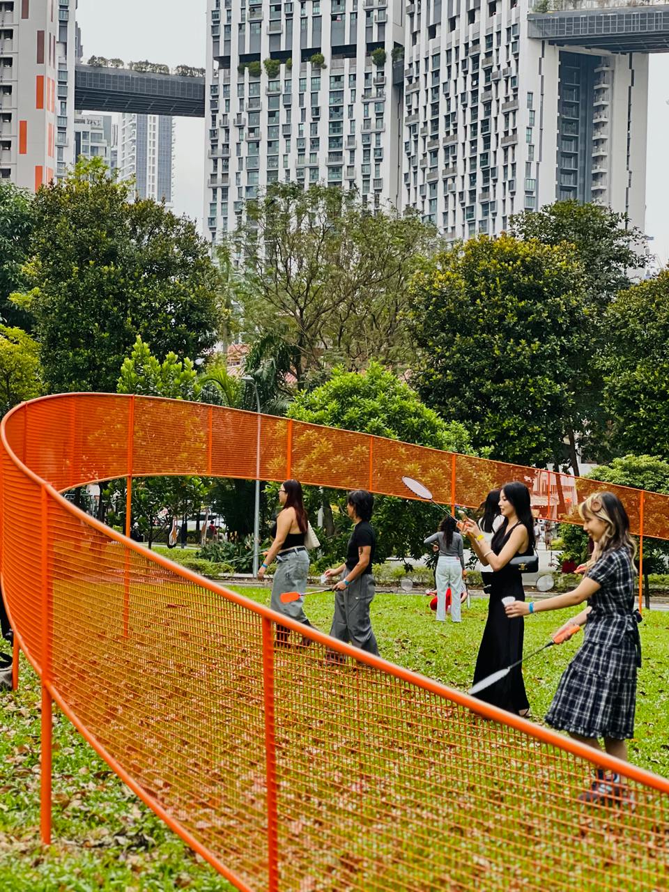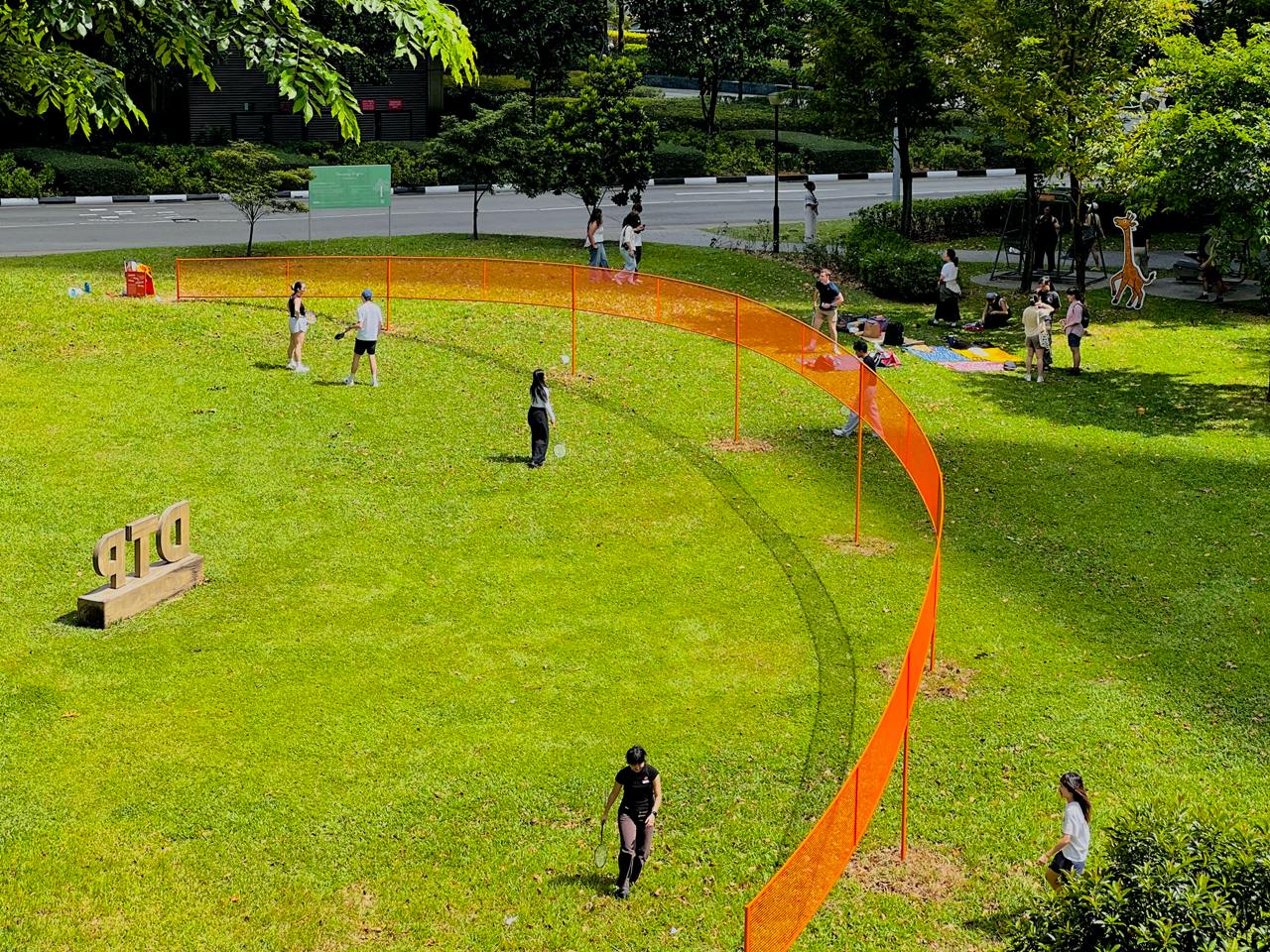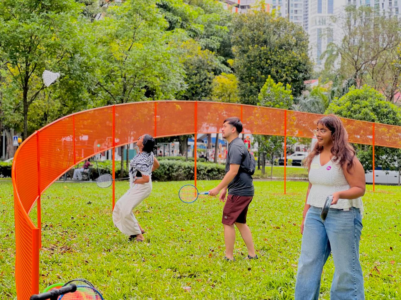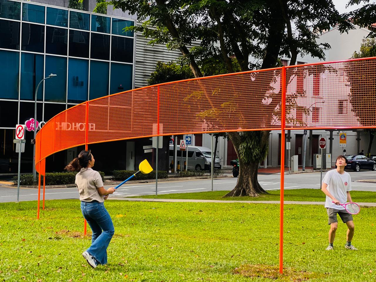 The public installation is called Bring Your Own Racket (BYOR), and it’s a sculptural artwork that’s part of Singapore Art Week. The artwork itself is eye-catching, it reinvents the familiar straight badminton net into something more experimental: with its bold red colour, curved lines and varying heights. But it’s not just a visual spectacle, it’s fully functional and playable as well. True to its name, visitors are free to come and experience the artwork hands-on and play using literally any kind of object as a racket.