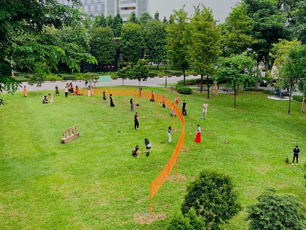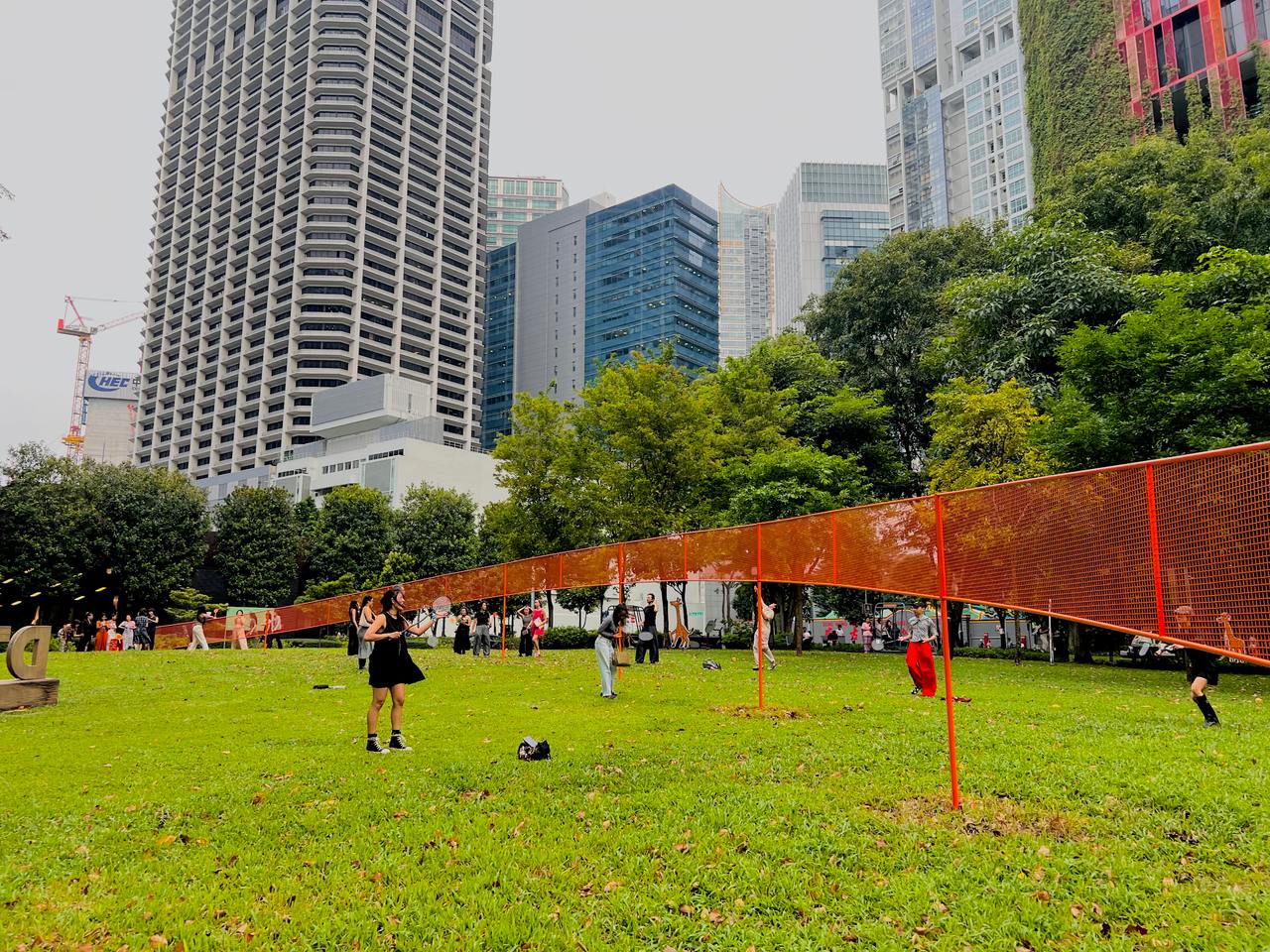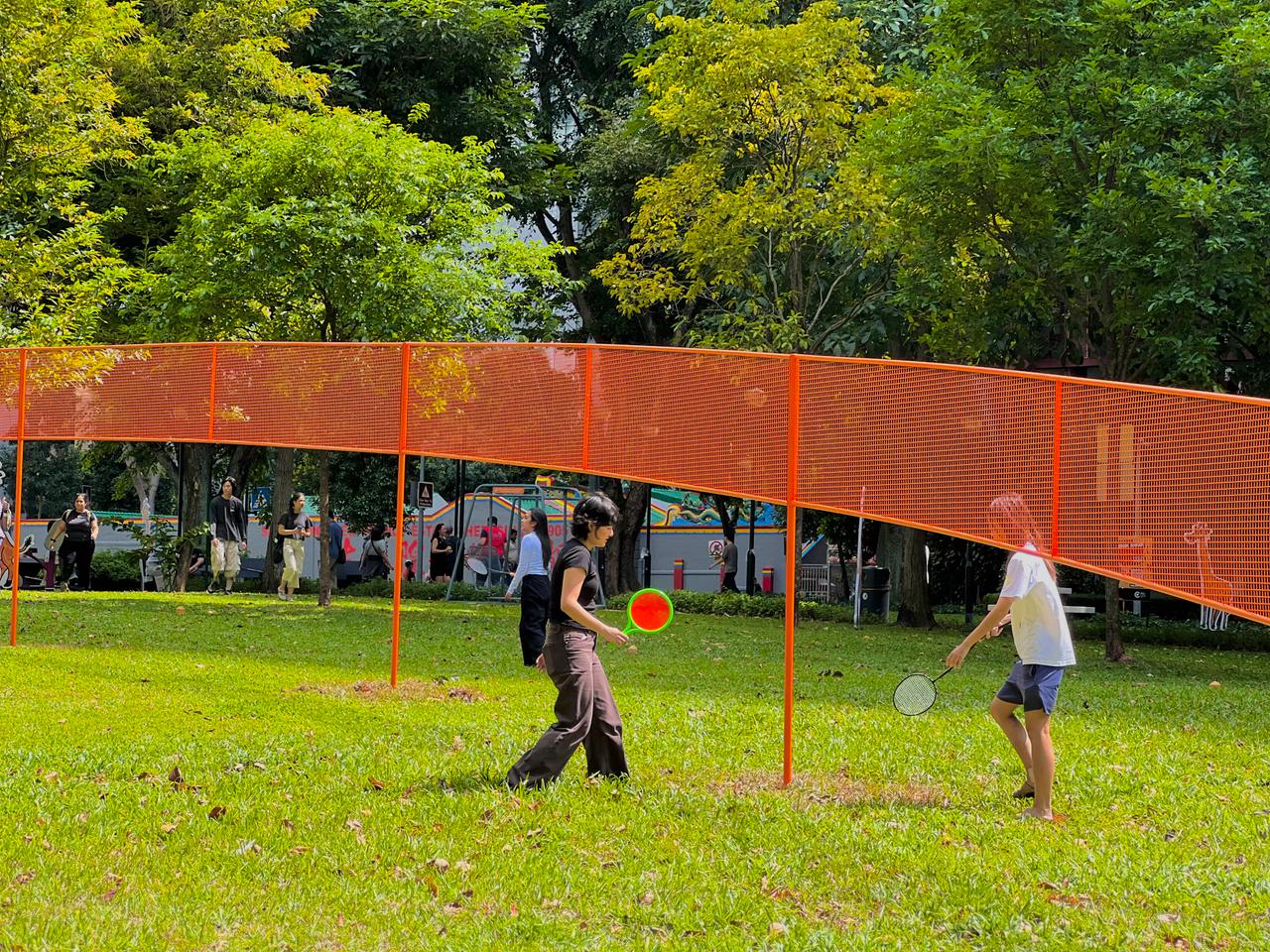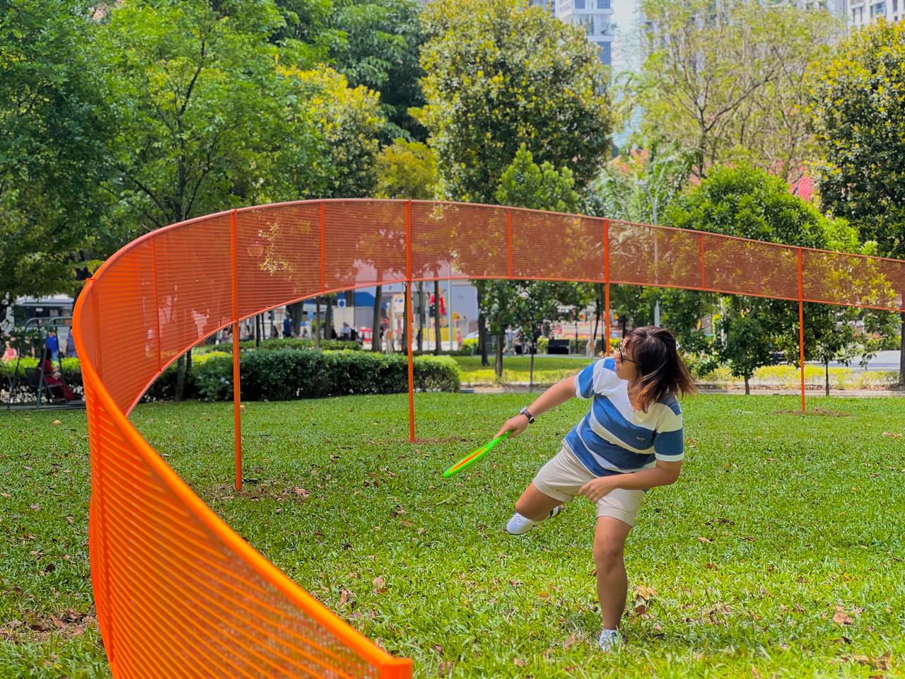 The public installation is called Bring Your Own Racket (BYOR), and it’s a sculptural artwork that’s part of Singapore Art Week. The artwork itself is eye-catching, it reinvents the familiar straight badminton net into something more experimental: with its bold red colour, curved lines and varying heights. But it’s not just a visual spectacle, it’s fully functional and playable as well. True to its name, visitors are free to come and experience the artwork hands-on and play using literally any kind of object as a racket.