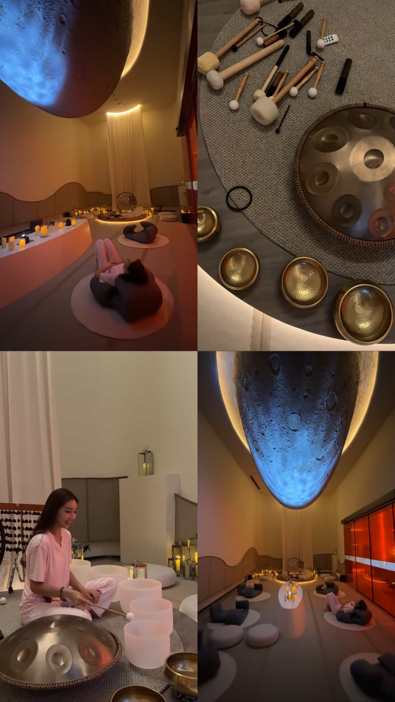 Instead, we explored the meditation room, which is complimentary. The ceiling features a moon installation designed for guests to lie back and relax under. The room is decorated with candle-like lighting and includes meditation tools such as singing bowls and even a steelpan.