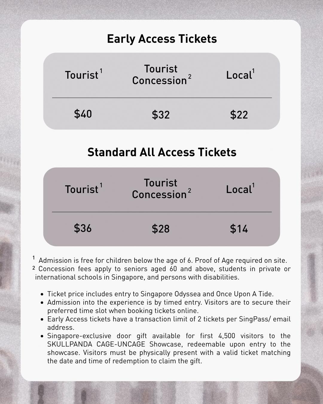 The SKULLPANDA CAGE-UNCAGE Showcase will be in Singapore from 12th December 2025 to 22nd February 2026, and is a ticketed event. There will also be various art installations at the Front Lawn and Level 1 Spaces that are not ticketed and free for all to explore. Tickets to the showcase are as follows: