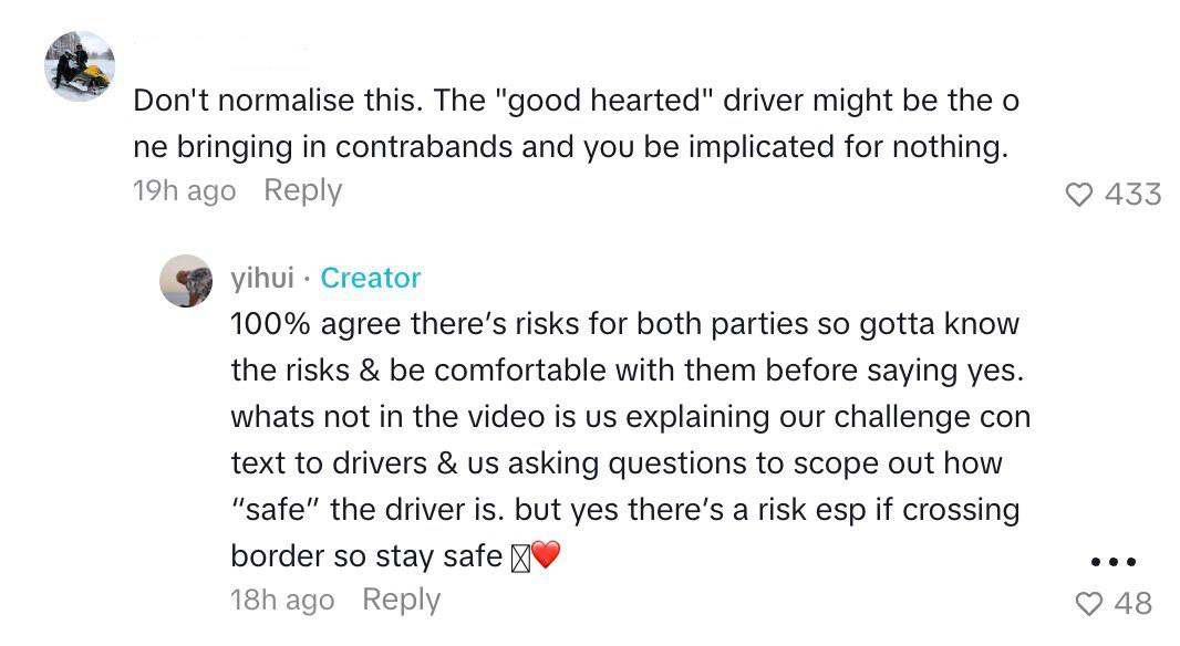Of course, that’s not to overly romanticise the concept of hitchhiking. Naturally, comments on Yi Hui’s videos documenting the hitchhiking journey were not all positive, as many were concerned about the risks involved and safety. To that, Yi Hui stresses that “balancing safety and adventure is key”—hitchhiking is not for the faint hearted. It’s uncomfortable, emotionally and physically draining, and not to mention very risky for both hitchhikers and drivers involved. When attempting to hitchhike, it’s important to always stay safe, and “trust your gut”. Better still: share your location with close friends and family members too, just in case.