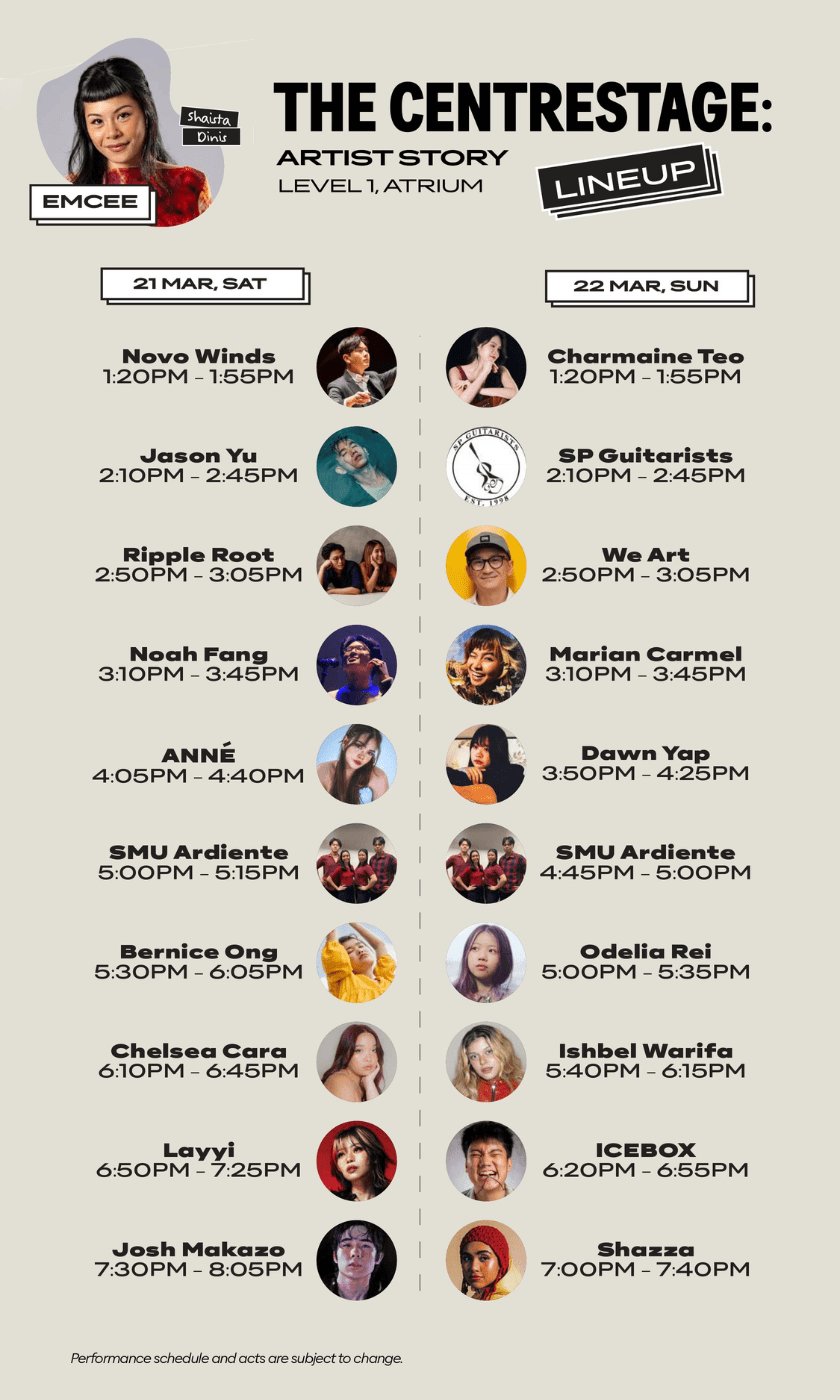 The line-up doesn’t stop there. Across both days, audiences can also catch a mix of up-and-coming artists and student ensembles including Jason Yu, ANNÉ, Noah Fang, Bernice Ong, Ishbel Warifa, Chelsea Cara, Layyi and ICEBOX — making for a packed programme of live performances throughout the weekend.
