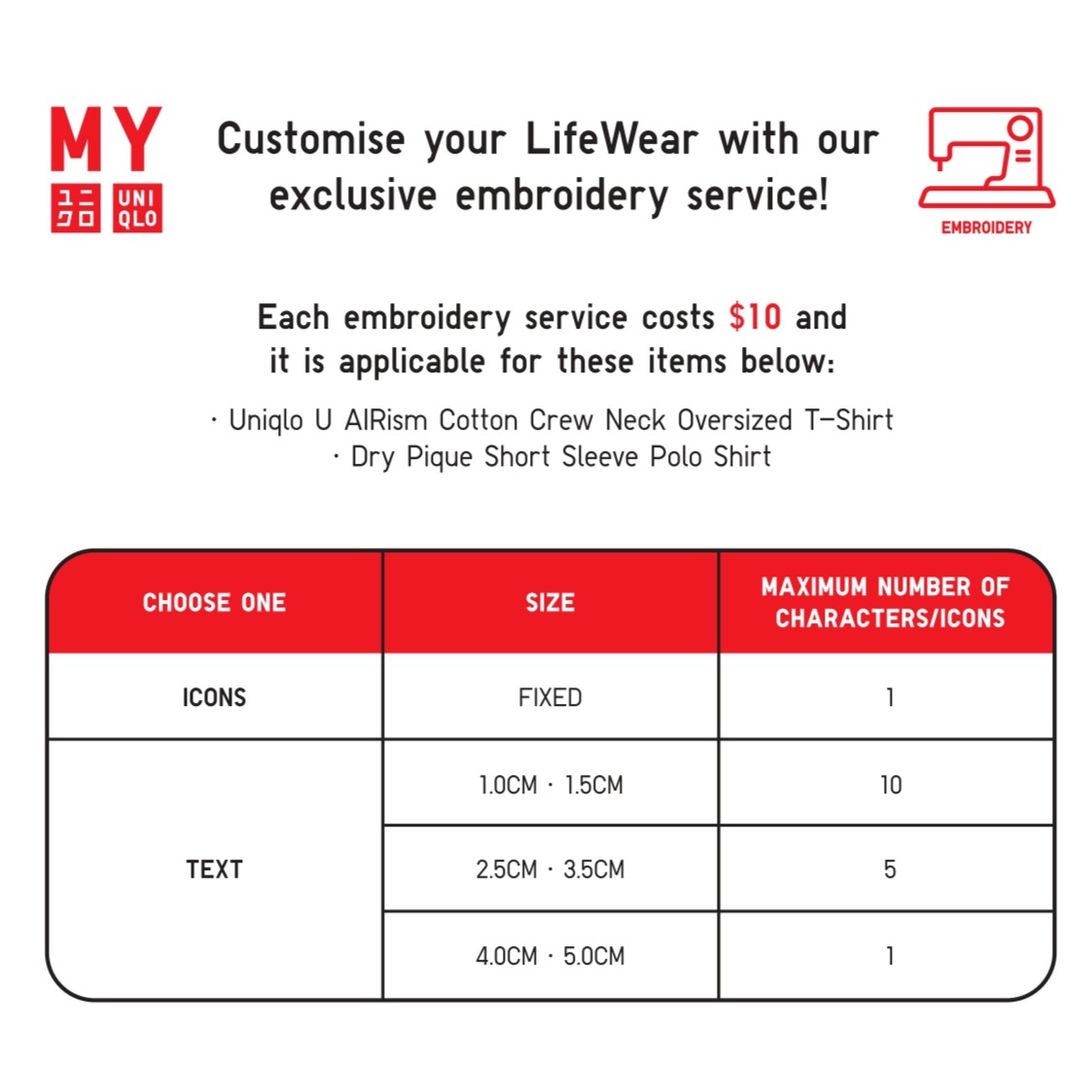 Previously, you could only customise UNIQLO’s t-shirts with the UTme! printing service, but now customisation services have been extended to include UNIQLO’s LifeWear series with custom embroidery services! This new MY UNIQLO embroidery service lets you choose your favourite icons or text to embroider on selected regular-price UNIQLO tops. Each embroidery service costs $10 and is only available for the following UNIQLO items: UNIQLO U AIRism Cotton Crew Neck Oversized T-Shirt and Dry Pique Short Sleeve Polo Shirt. For more details on the embroidery service, see here.