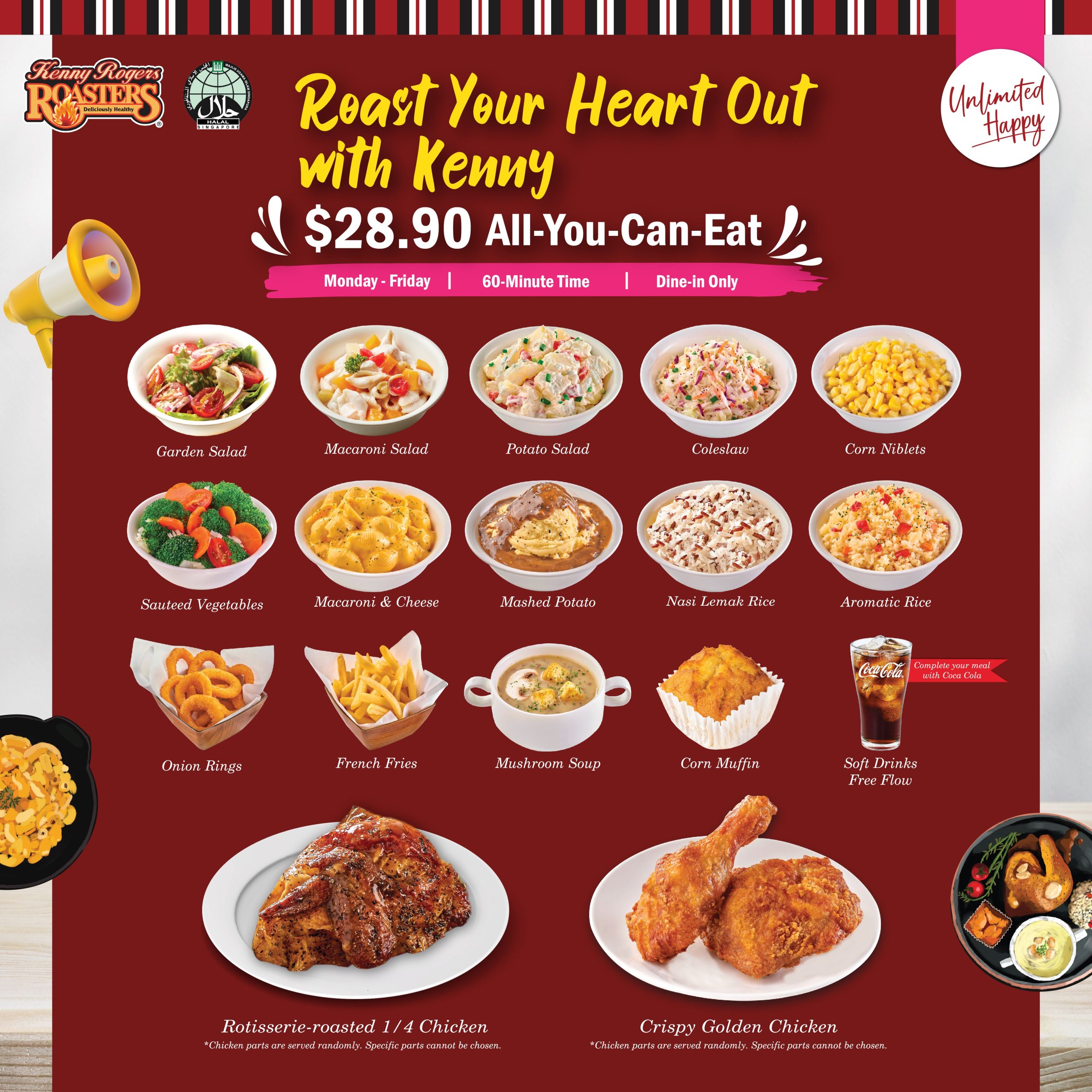 The new à la carte buffet at Kenny Rogers lets you feast on over 15 items, with unlimited roasted and fried chicken, sides and soft drinks. Enjoy free flow servings of items like Rotisserie-Roasted Chicken, Crispy Golden Chicken (Original/Spicy), Macaroni & Cheese, Mashed Potatoes, Potato Salad, Nasi Lemak Rice, Onion Rings, Fries, Signature Corn Muffins and more. The buffet also includes free flow soft drinks like Coke.