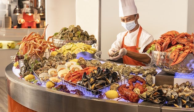 Expect a luscious seafood and meat spread with the likes of snow crabs, chirashi dons, baby octopus, slow cooked BBQ beef brisket, Irish lamb, seafood tom yum, butter cereal prawns, steamed seabass, double boiled chicken soup, roasted duck, fish curry and much more. For the full buffet menus, see here.