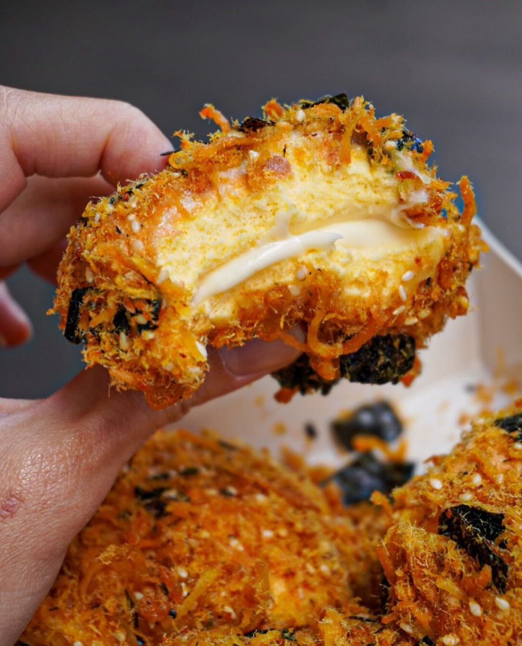 They’re most known for their famous Seaweed Crispy Floss Cake, a unique ball-shaped bun with a fluffy chiffon-like interior, milky cream centre and coated with crispy pork floss. These freshly-baked ball-shaped floss buns are so viral that the store sells over 200 million of them in a year. Other popular bakes you can get at Bao’s Pastry include pineapple cakes, egg tarts, cheesecakes, coconut pastries, butter mochi buns and more.