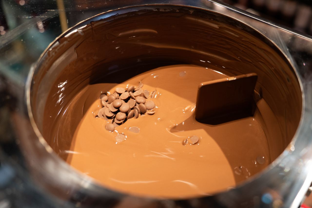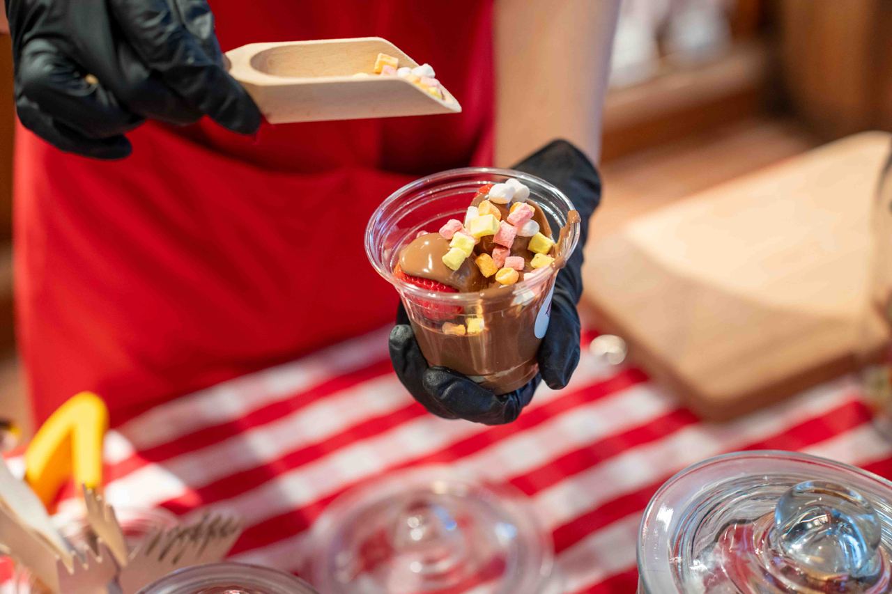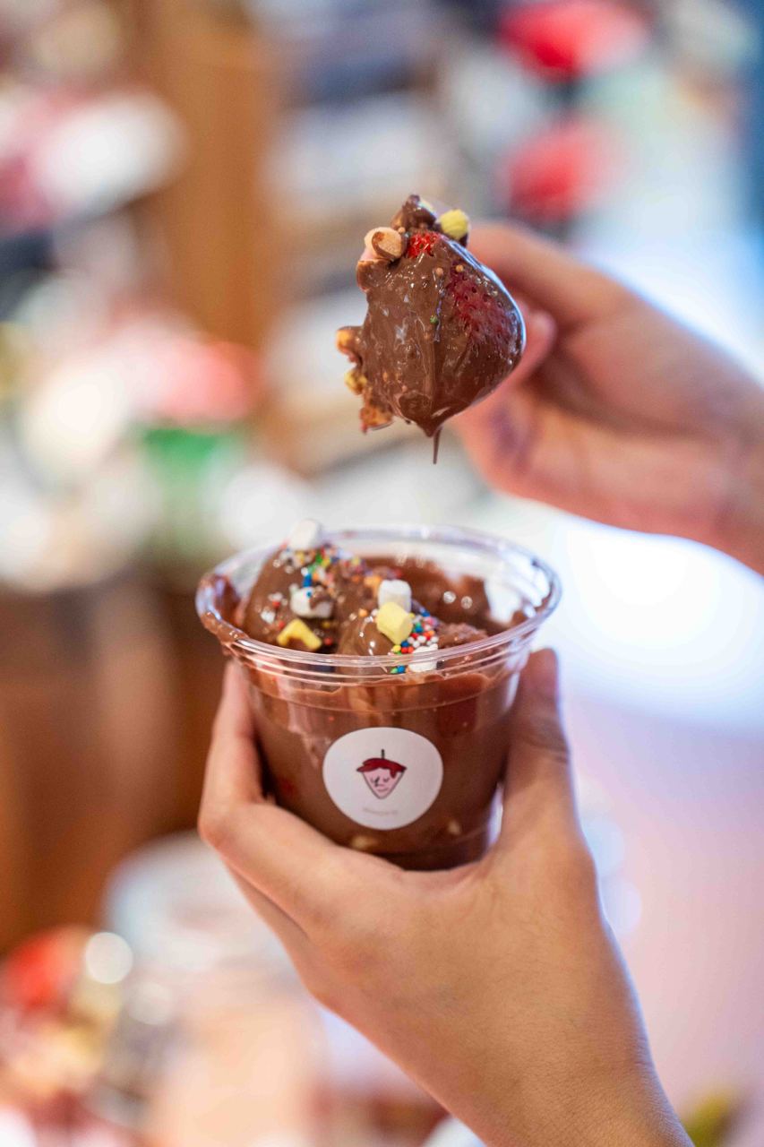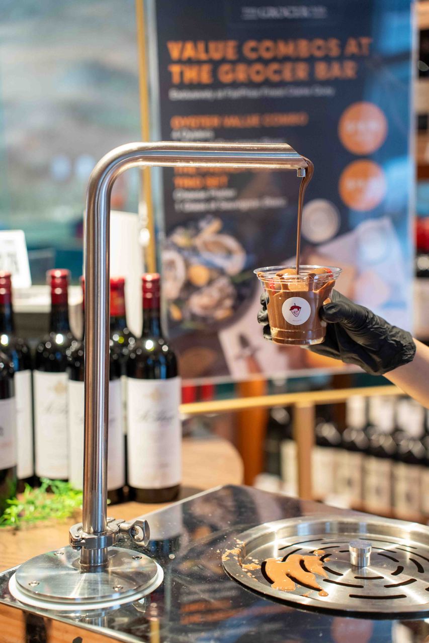 The milk chocolate is melted on-site, and the Tabby machine constantly stirs the melted chocolate, keeping it super smooth always. The melted chocolate is ever-flowing through the tap, and drizzled generously over fresh fruit cups before being topped with extra toppings of your choice.