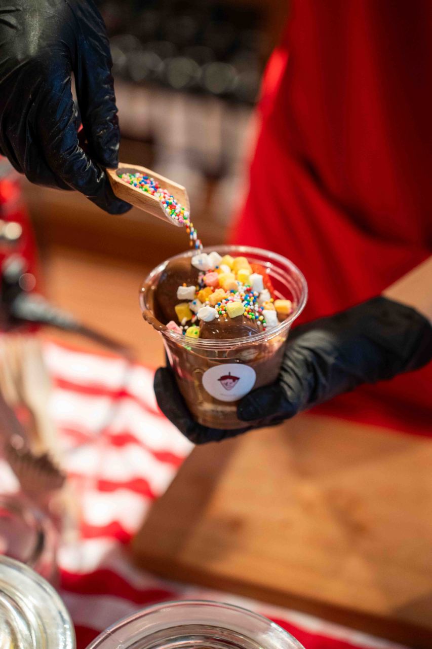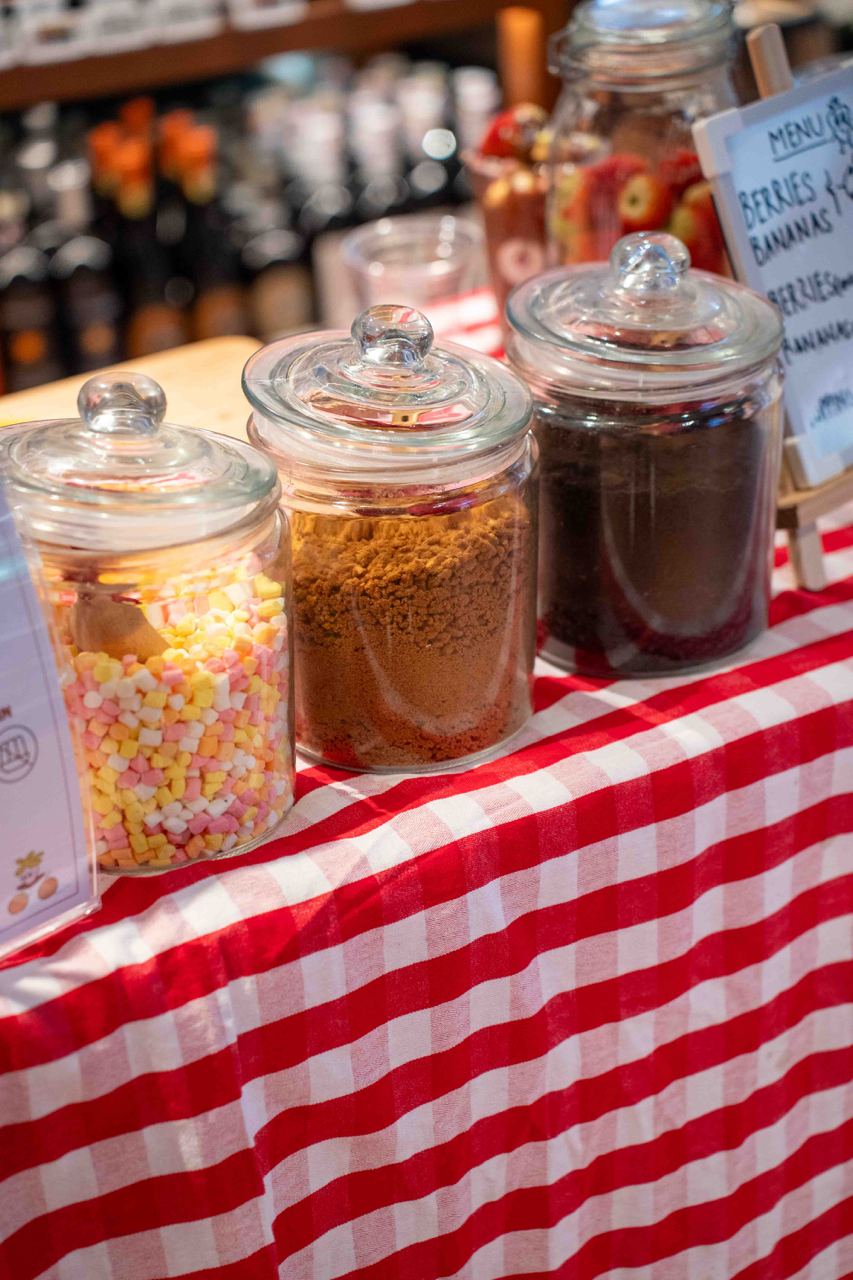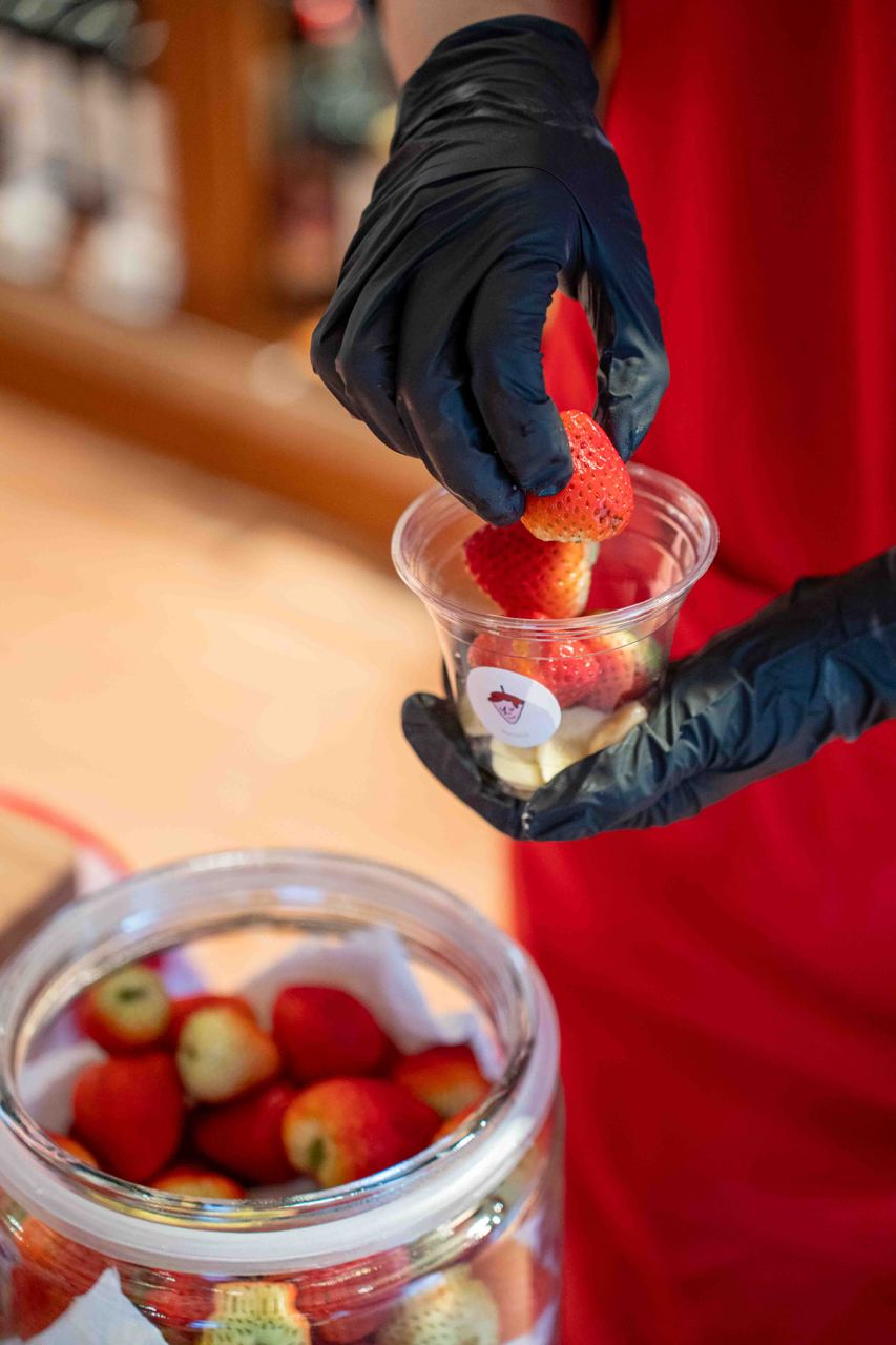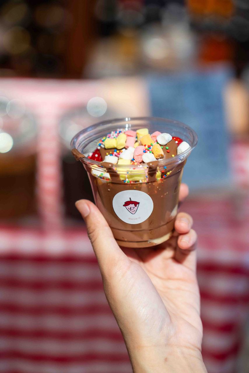 The milk chocolate is melted on-site, and the Tabby machine constantly stirs the melted chocolate, keeping it super smooth always. The melted chocolate is ever-flowing through the tap, and drizzled generously over fresh fruit cups before being topped with extra toppings of your choice.