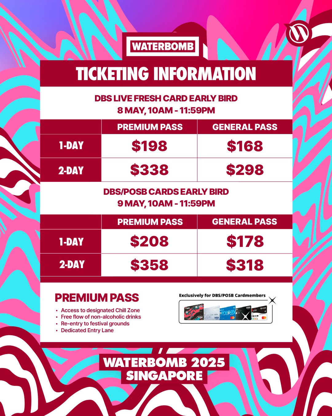 Early Bird tickets for Waterbomb Singapore 2025 go live tomorrow, 8th May 2025, from 10am to 11.59pm, exclusively for DBS Live Fresh cardholders. Other DBS/POSB cardholders can also enjoy special Early Bird rates on 9th May 2025. Tickets for this year’s Waterbomb Singapore 2025 are priced from $168 to $458. For more details and to get your tickets, see here.