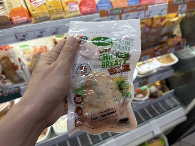 Even the chilled food aisle reflects this pivot. Alongside sandwiches and rice bowls sit individually packed chicken breasts in multiple flavours — starting from around $3.10 — positioned less as a meal and more as a functional protein fix.
