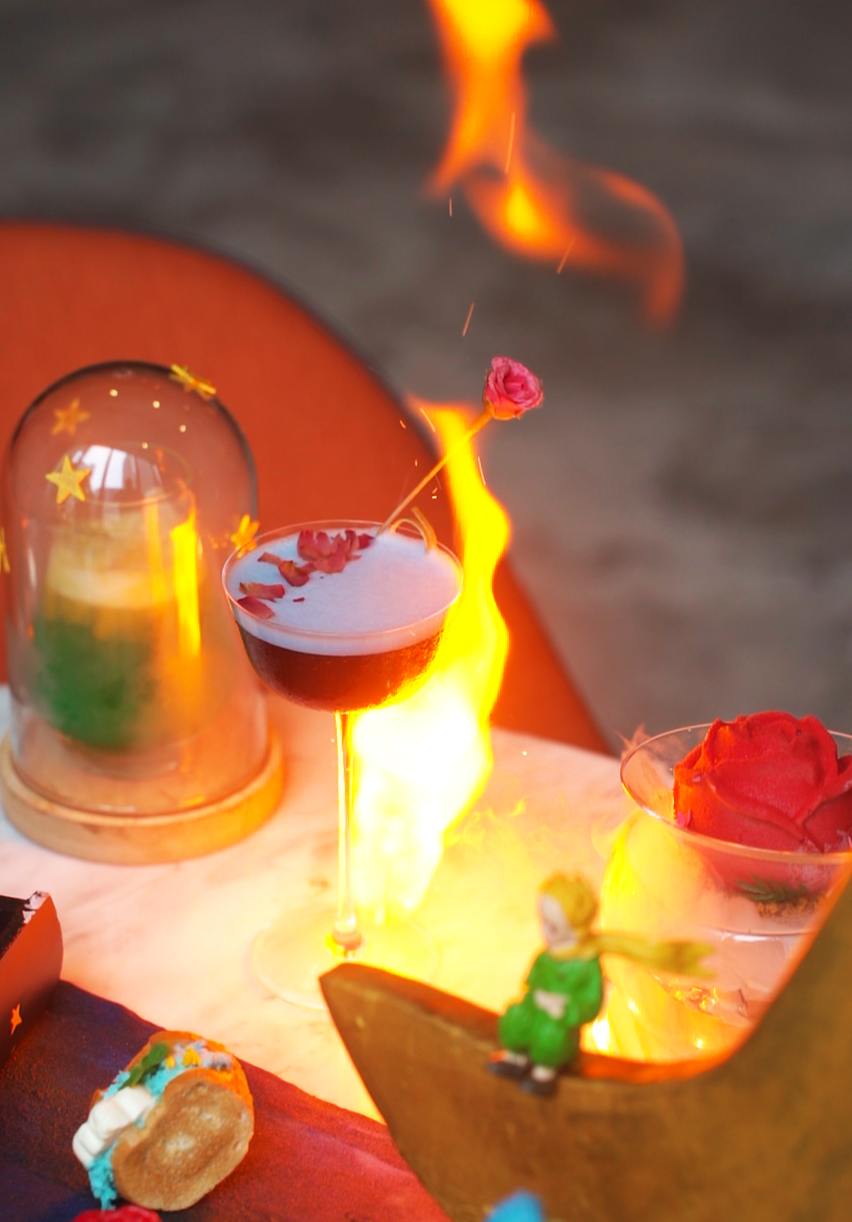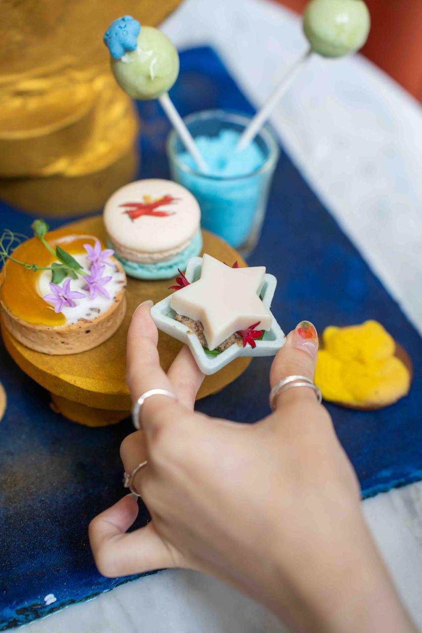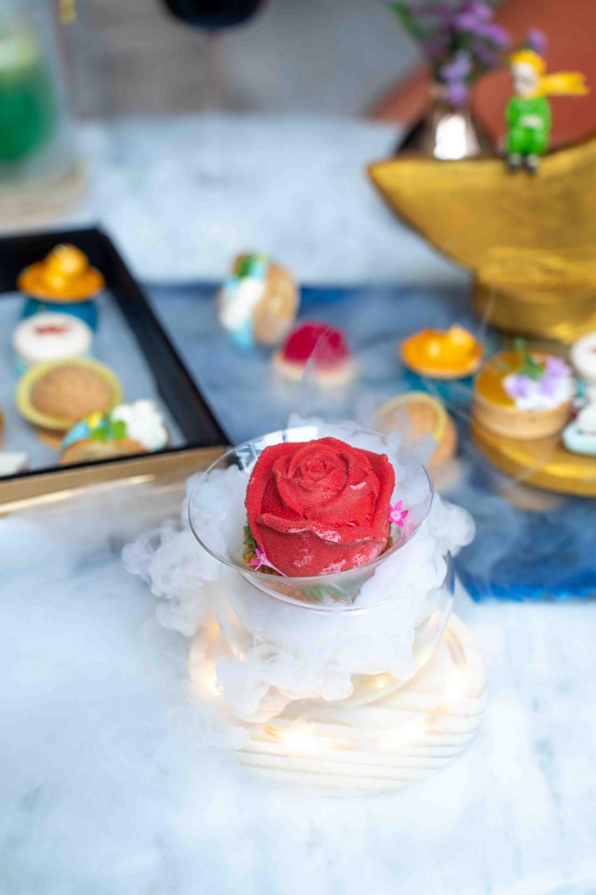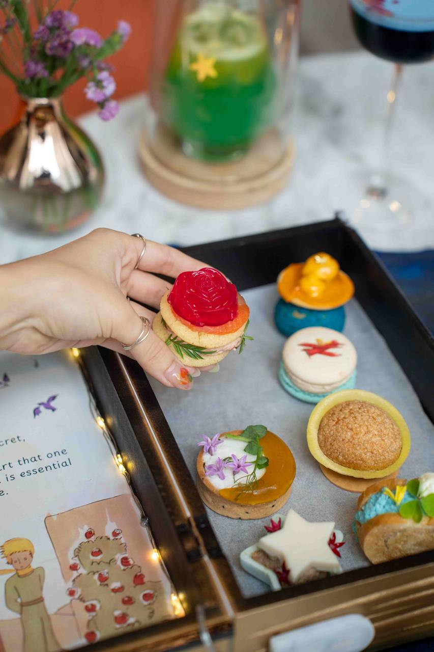 The Le Petit Prince Afternoon Tea features theatrical and eye-catching elements: like treats served in a “storybook”, flaming cocktails, and rose-shamed treats. The high tea set comes with a selection of handcrafted sweets and savouries inspired by The Little Prince book. Some of the items are reminiscent of characters from the book, including fox-shaped cookies, star-shaped monaka, edible “rose” mousse cake, crescent moon-inspired tarts and also macarons imprinted with the iconic Little Prince himself.