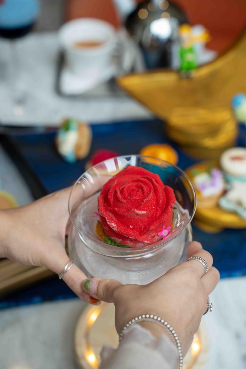 Some of our favourite items from the high tea include the rose-shaped Raspberry & Rose Mousseline, which came in a “smoking” glass orb for that ultra-whimsical effect. Other playful treats we enjoyed include the Lime & Lemongrass Lollipop that’s topped with a miniature blue star and the Chocolate Sablé which had a Thai tea-infused fox character topping.