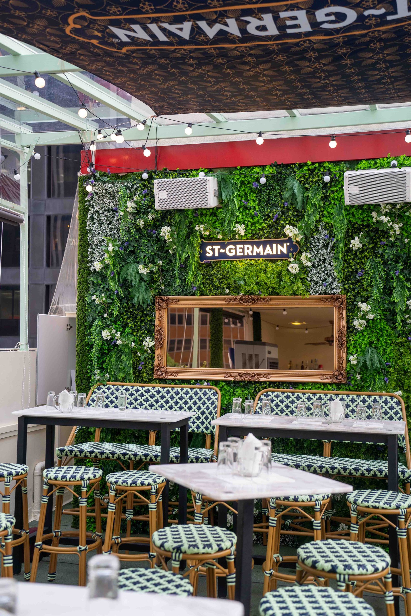 The final fourth level holds a gorgeous Parisian-inspired rooftop space, complete with rattan high stools and benches, and even patio umbrellas to shield you from the weather.