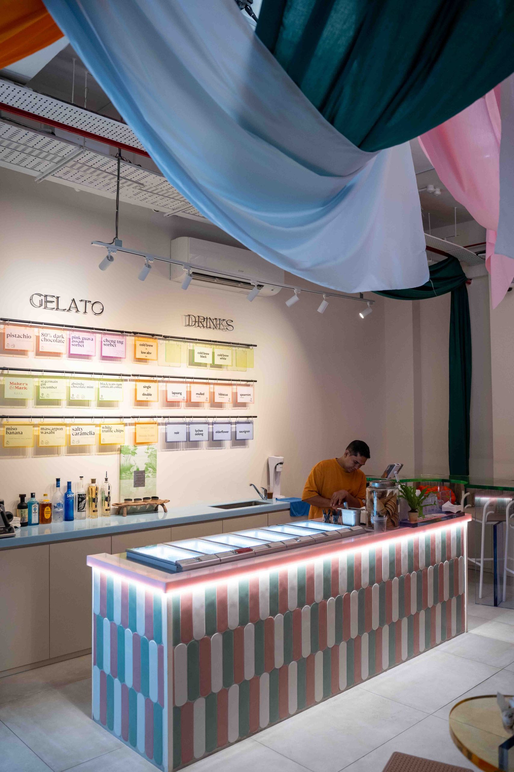 The first level of White Shades features their dessert bar slash café, where you can get artisanal gelato scoops, alcohol-infused cold brew teas and coffee. The space looks almost like something out of an art gallery, with quirky wonky shaped acrylic furniture, and colourful hanging fixtures from the ceilings—really Instagrammable.